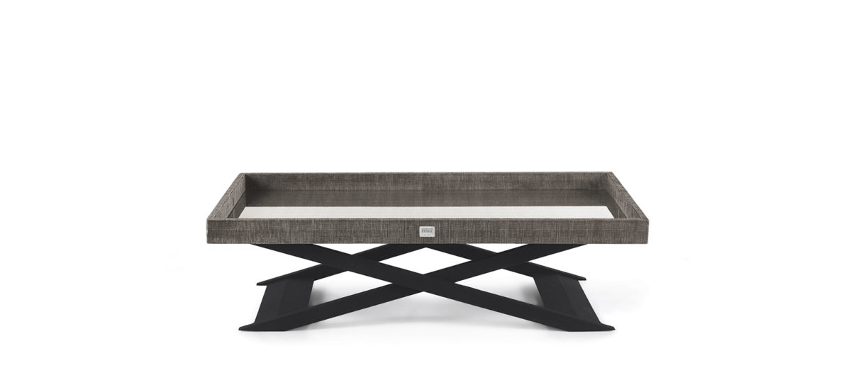 带托盘的中央桌子。底座采用山毛榉木制成,覆盖着黑色超细纤维。2 个皮革手柄。托盘在多层杨树覆盖织物猫。C |L.14.01