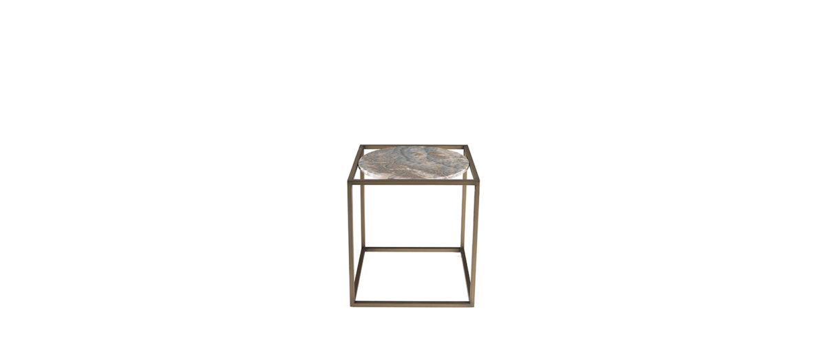由几何形状和不同材料组成的桌子结合了矩形结构的复古魅力和古铜色饰面,以及灰色玛瑙圆顶的珍贵和永恒的吸引力。边桌,金属结构,古铜色饰面。顶部在灰色浑浊的缟玛瑙。