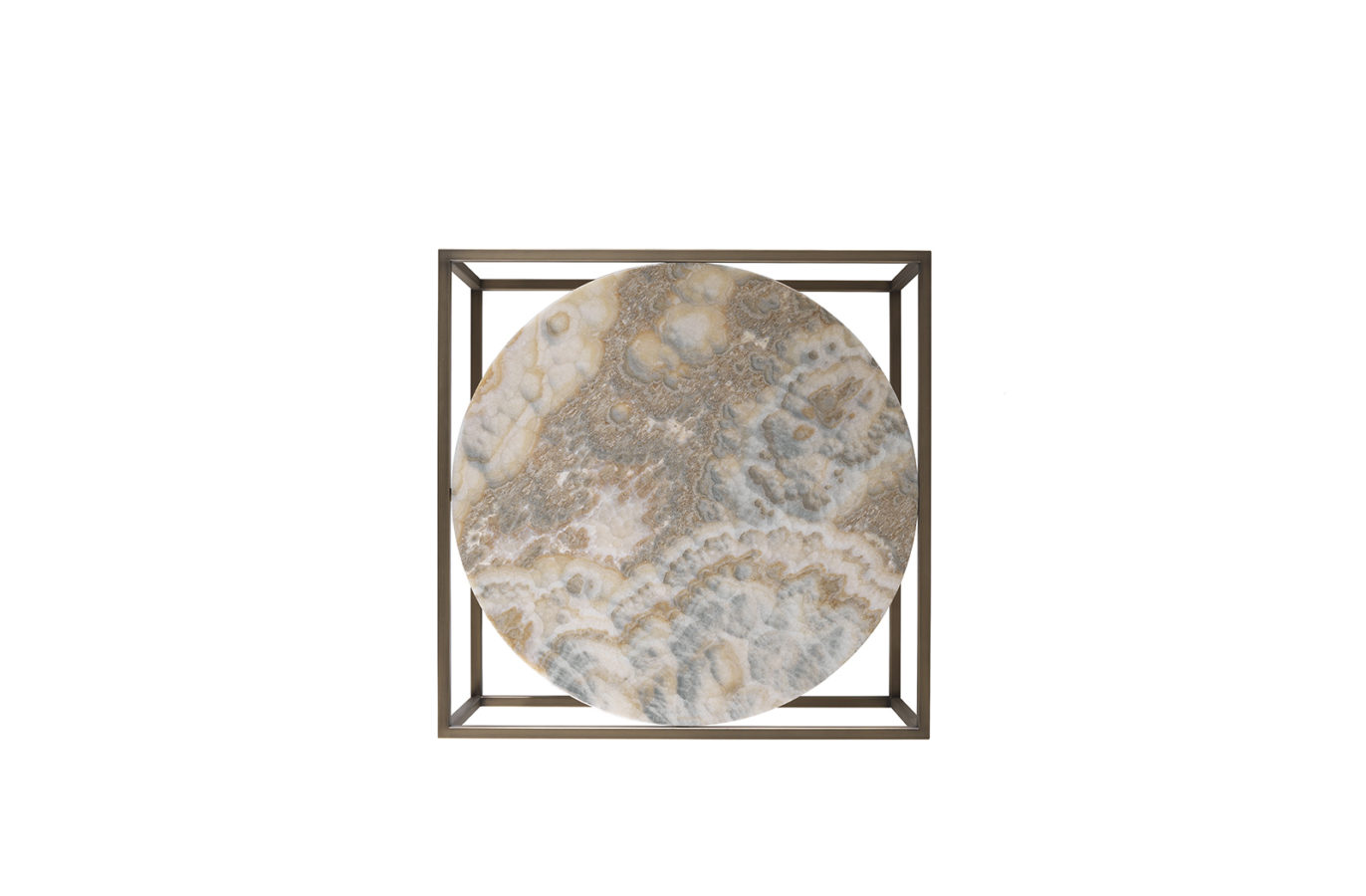 由几何形状和不同材料组成的桌子结合了矩形结构的复古魅力和古铜色饰面,以及灰色玛瑙圆顶的珍贵和永恒的吸引力。中央工作台,金属结构,古铜色饰面。顶部在灰色浑浊的缟玛瑙。