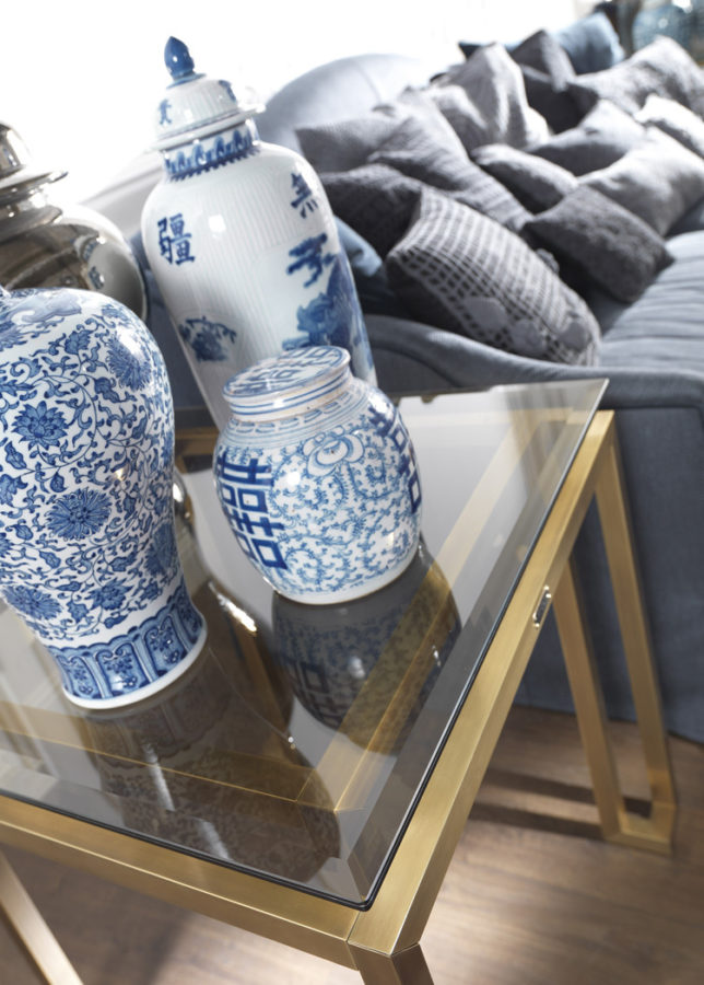 边桌,金属结构,古铜色饰面。耦合玻璃顶部(超透明+烟熏)。