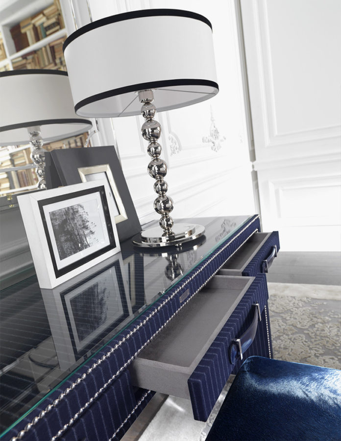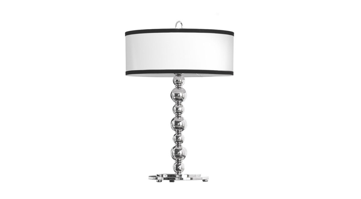 黄铜和铁结构台灯。带有大球体的框架。镍或金饰面。浅色调与象牙色下巴皮革织物与黑色织物细节。