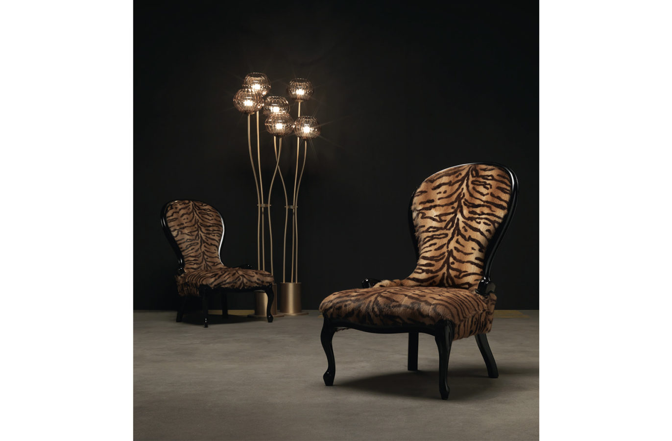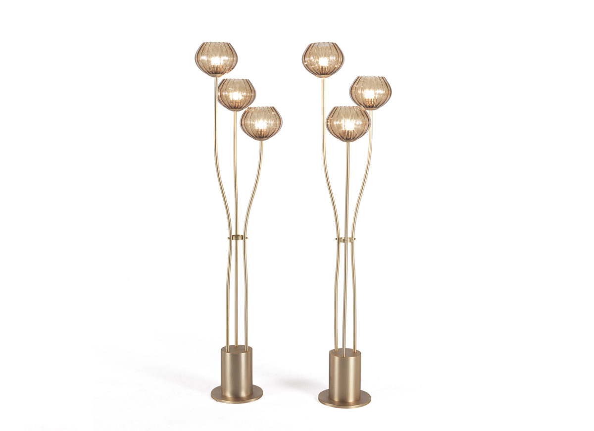 金属结构落地灯。哑光黄铜饰面,玻璃灯罩。