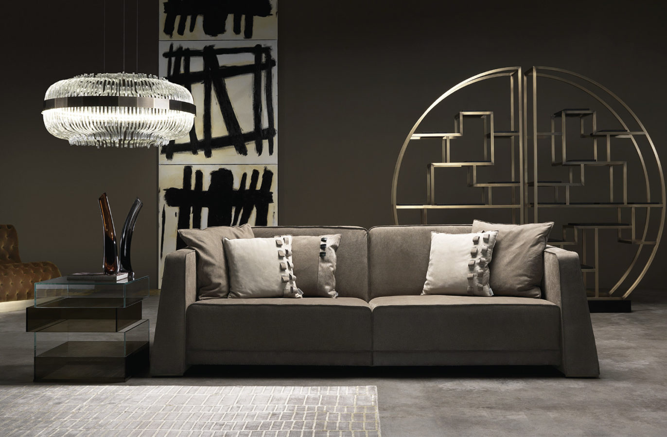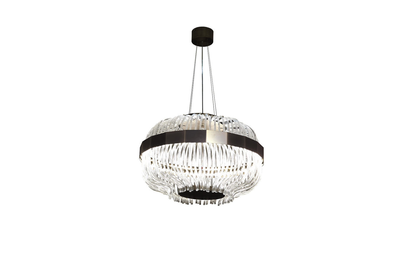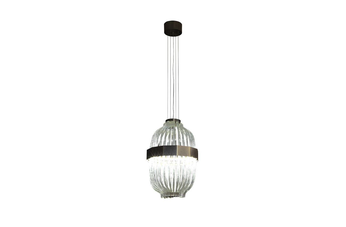黄铜结构枝形吊灯。拉丝镍表面处理。模制玻璃元件。