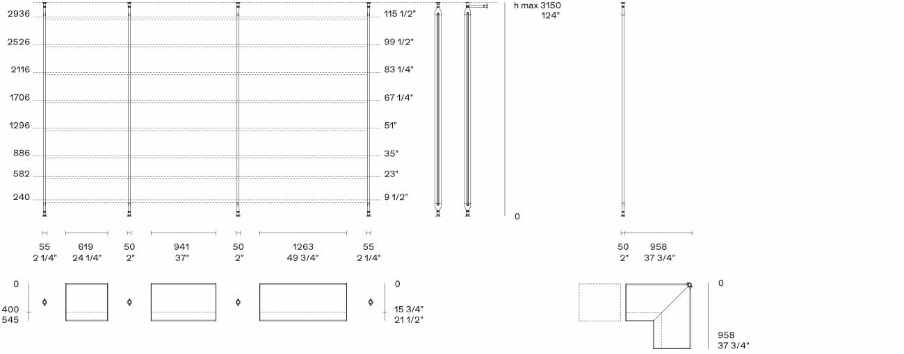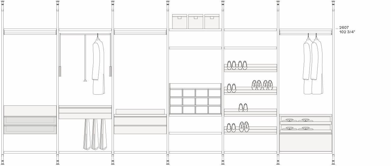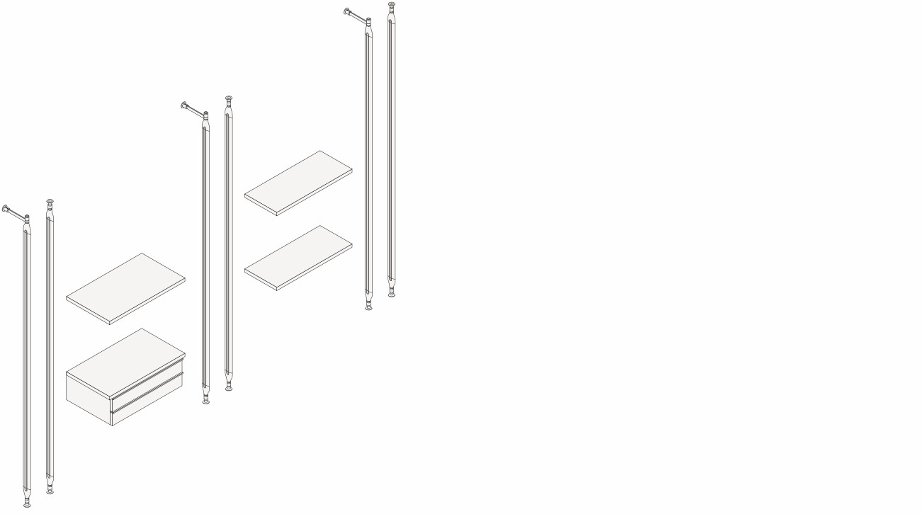 列克星敦是一个以柱子为基础的卧室系统,有两种配置:墙壁或天花板,在后者的情况下,有可能设计双面组合完成两面。架子、抽屉和各种各样的设备——与Senzafine系统相同——用香槟色或灰色石板漆的表面钩在立柱上。由于其在尺寸、应用和饰面方面的无限灵活性,莱克星顿也有一天的版本,标志着系统世界的进化,目的是实现住宅的不同房间的全面集成。