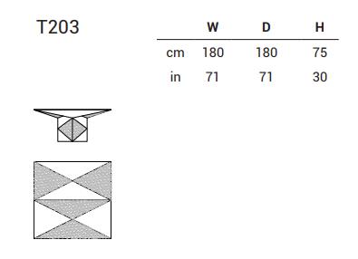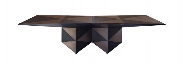 一系列完全用木头制成的桌子,带有刻面。顶部采用双对置三角形,在镶嵌中融入了底座的菱形几何形状。