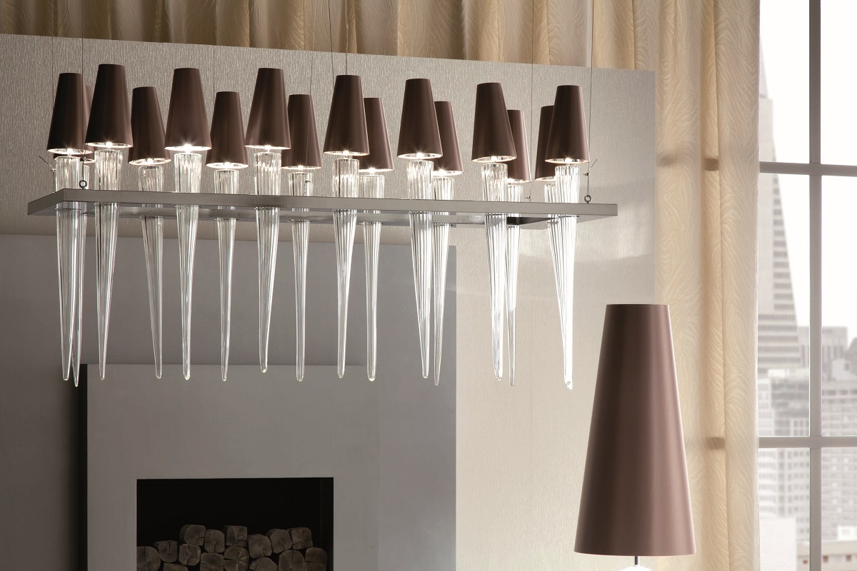 威尼斯"穆拉诺"吹制透明玻璃矩形吊灯。16盏灯插入镀铬不锈钢底座。棕色丝绸色调。