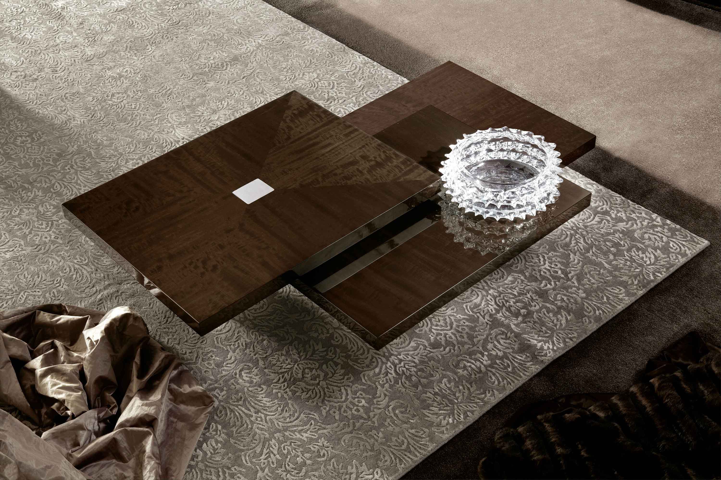 鸡尾酒桌,带3个不同的顶级欧洲卷曲桉树贴面,高光泽聚酯。顶部最高,中心带不锈钢嵌件。