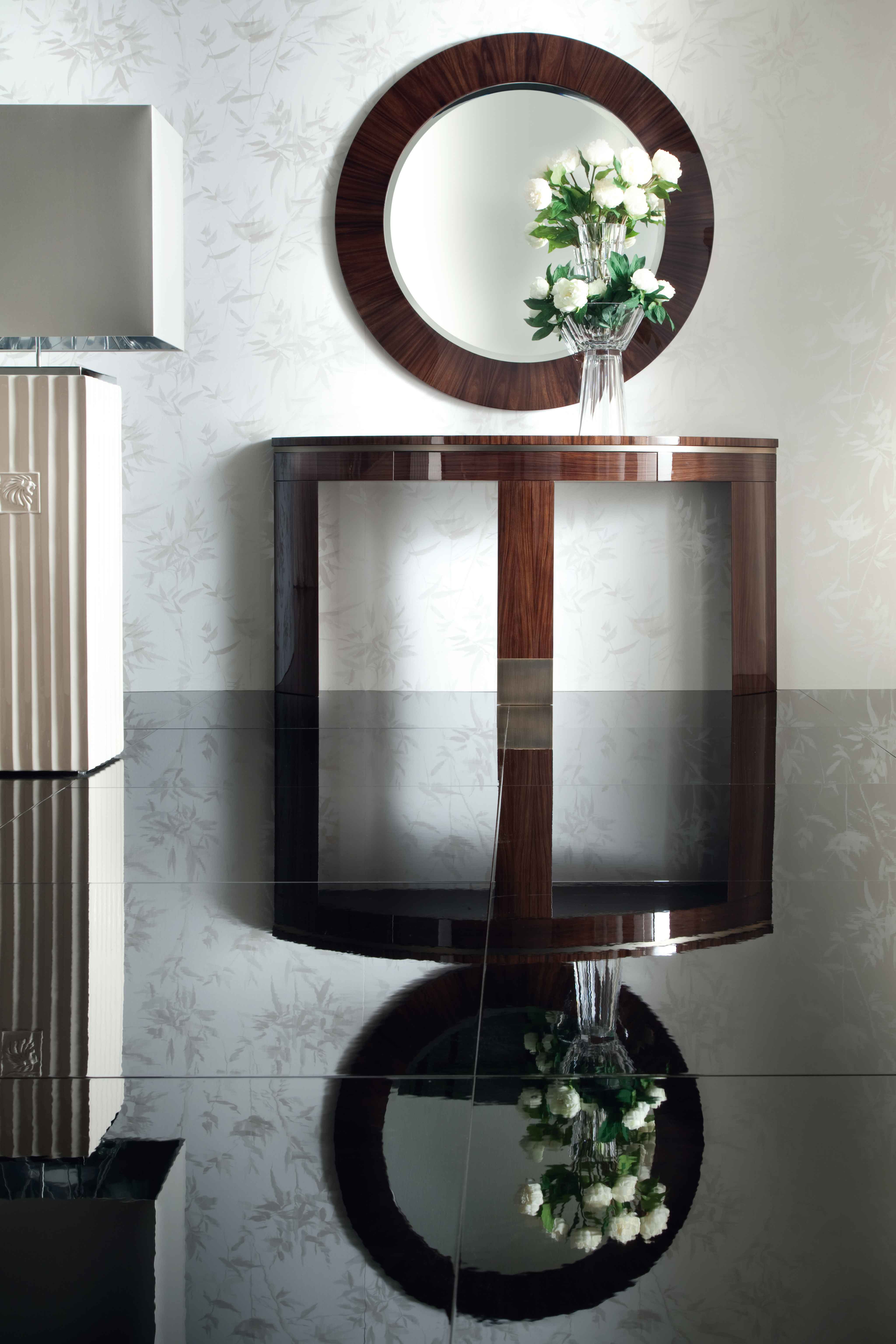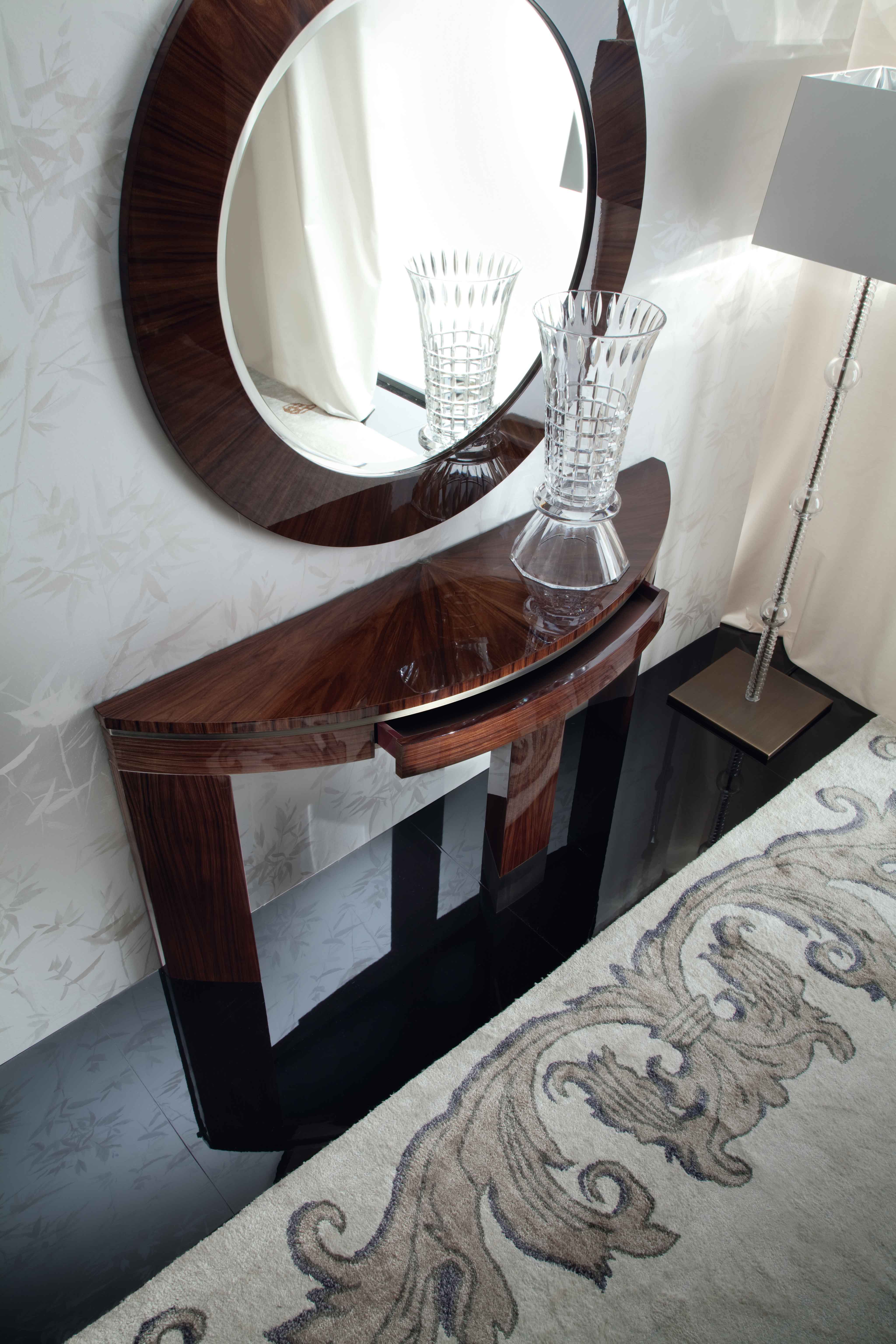 控制台采用巴西红木贴面,高光聚酯饰面和古铜色不锈钢细节。旭日单板上衣。1个全延伸抽屉,底部采用天鹅绒织物。