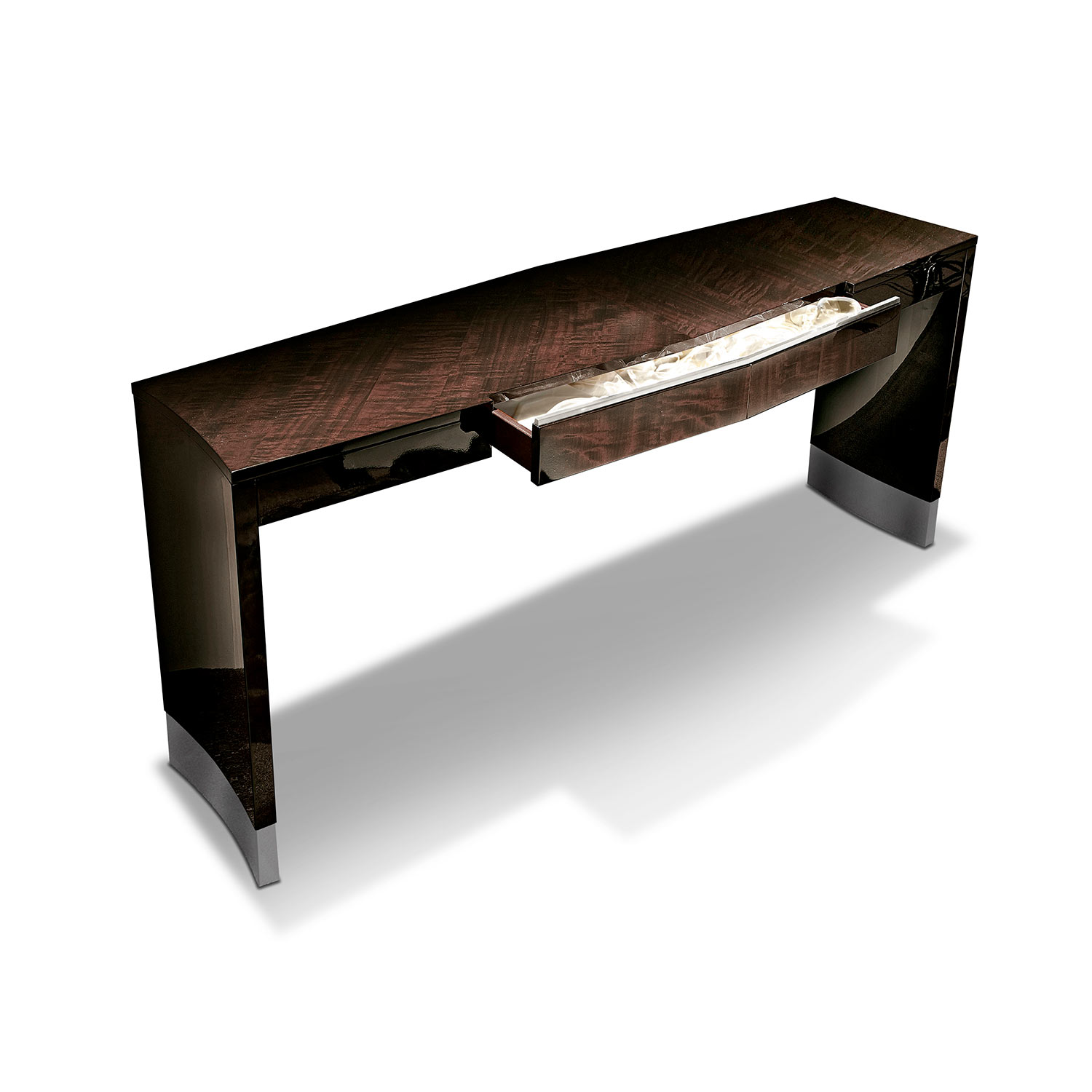 Consolle采用欧洲卷曲桉树贴面,采用高光泽聚酯纤维制成。1个中央全延伸抽屉,