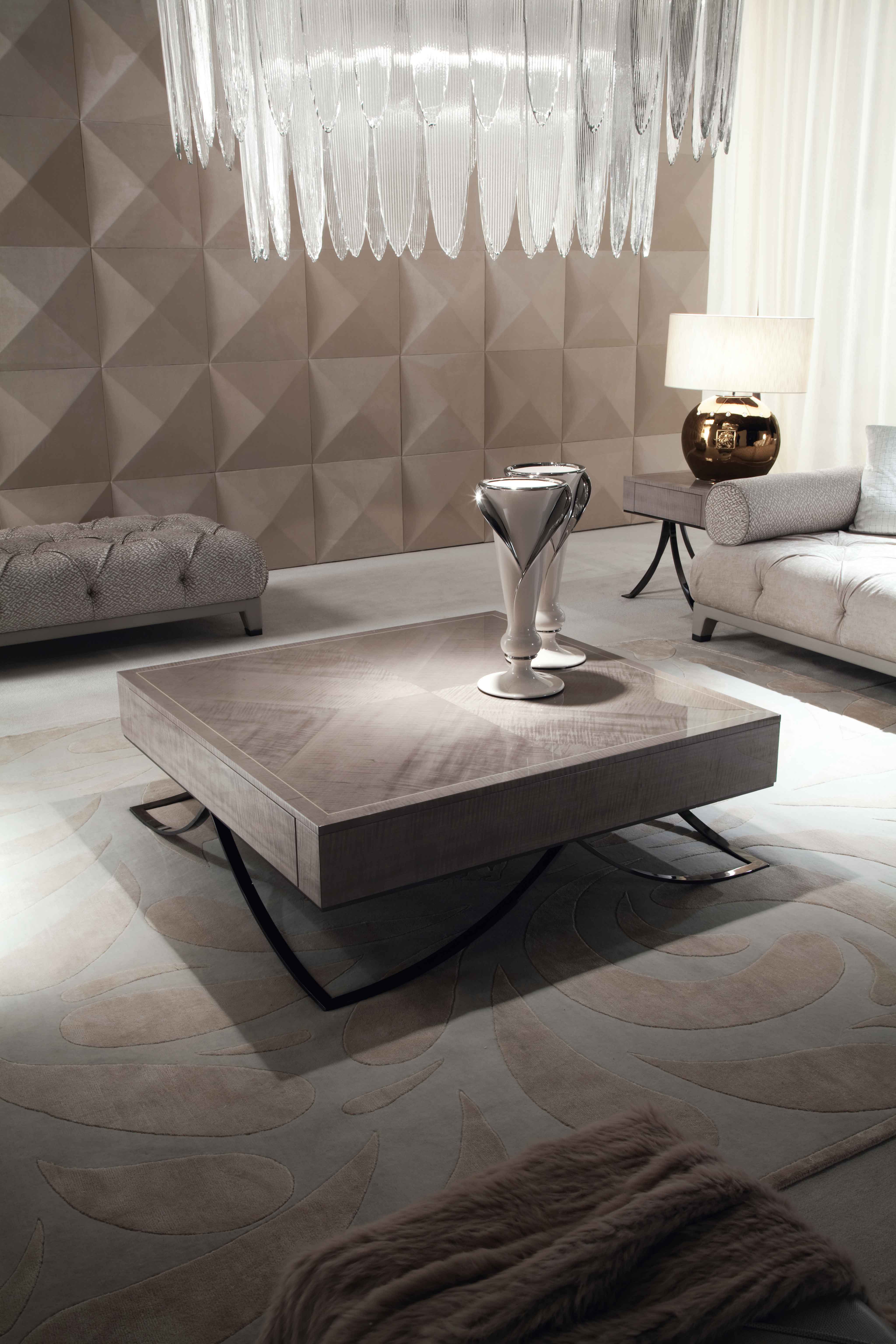 方形鸡尾酒桌,采用老虎非洲锡科莫尔贴面,具有高光泽聚酯饰面。白色枫木细线镶嵌在顶部。底座采用不锈钢制成,采用深灰色表面处理。2个全延伸抽屉,带底银色蜥蜴印花皮革。