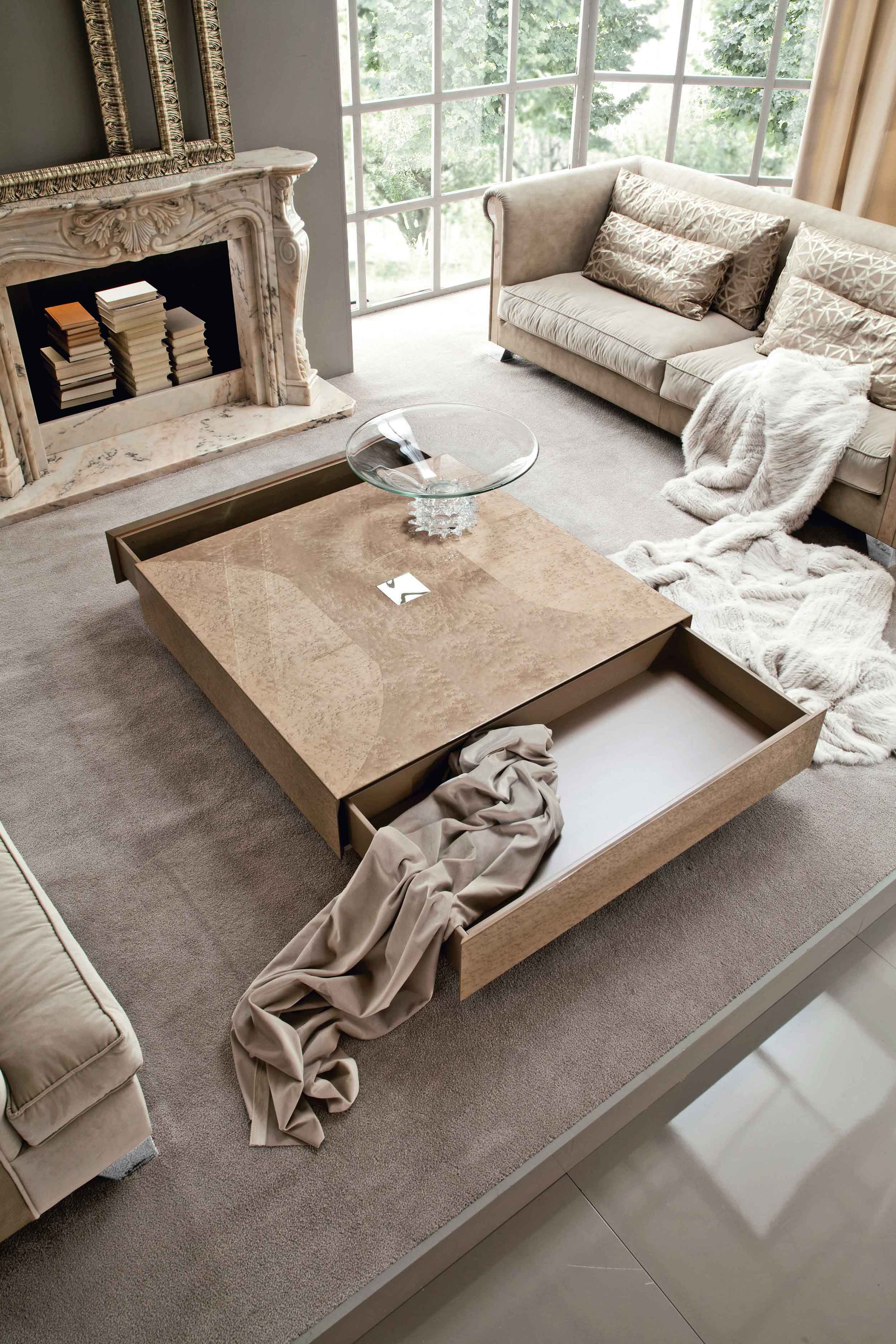 方形鸡尾酒桌,香槟鸟瞰枫木贴面。不锈钢镶嵌的顶部嵌件。高光聚酯饰面。2 个全延伸抽屉。不锈钢底座。