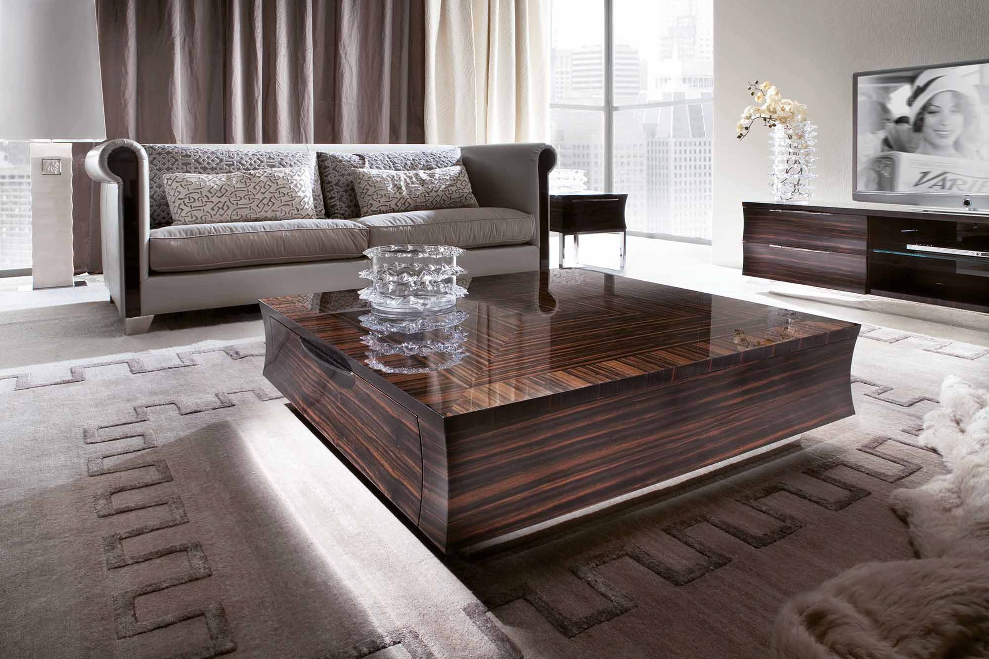 方形木制鸡尾酒桌,望加锡乌木贴面,缎面饰面。2个全延伸抽屉,底部采用天鹅绒面料。2个不锈钢手柄和底座。
