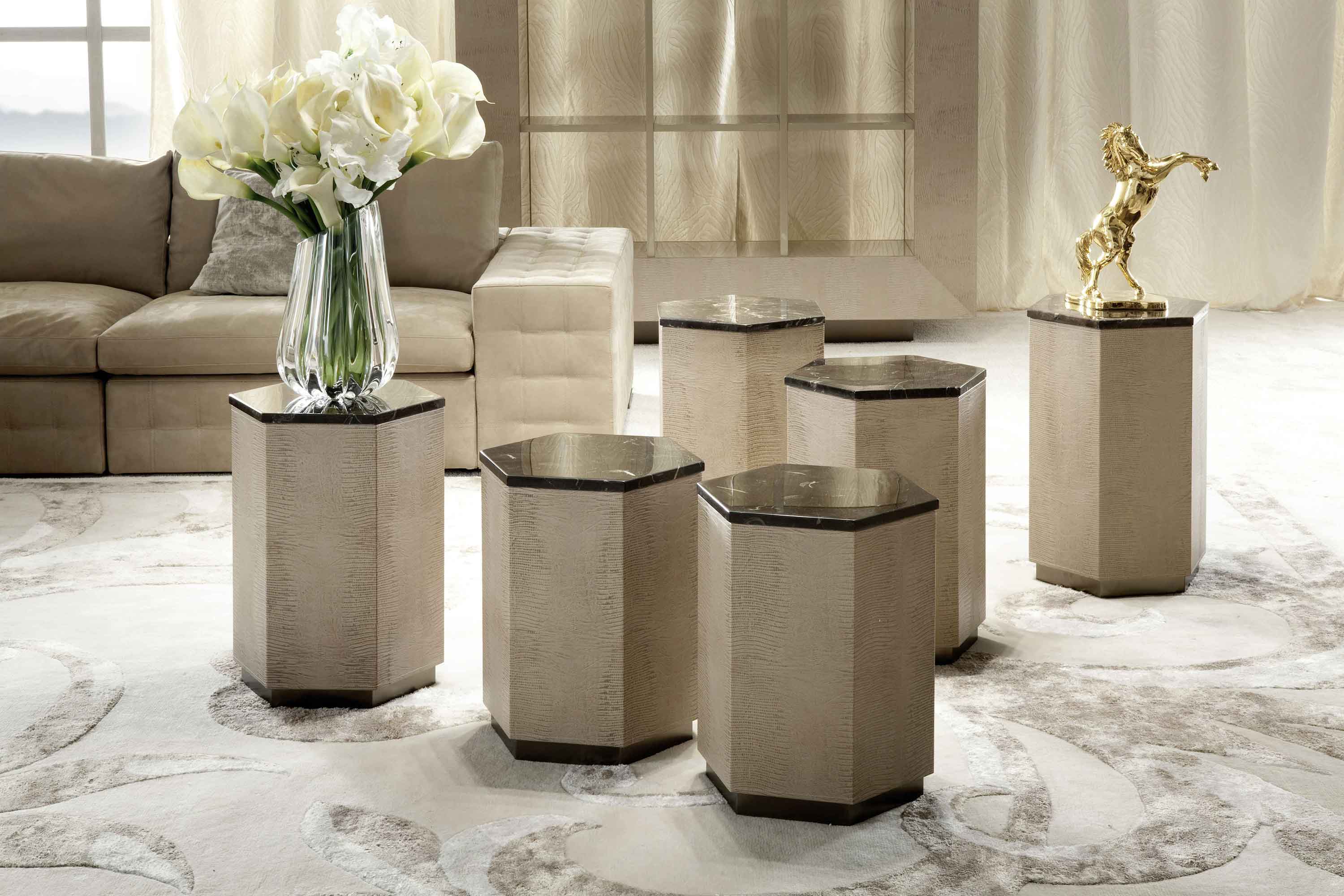八角形桌子,犰狳印花皮革,深色皇帝大理石台面。