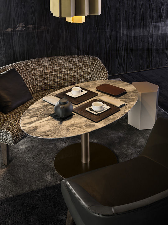 Bellagio"休息室"桌子系列不断扩展,包括底座和顶部的新饰面。底座采用管状金属制成,带有光泽的青铜漆面,而轮廓顶部有圆形和椭圆形版本,采用Sucupira贴面和彩色貂皮饰面或Bardiglio Nuvolato或Calacatta大理石装饰。Bellagio "Lounge"桌子的尺寸和饰面经过精心设计,可与2016年系列中的椅子(尤其是Reeves系列中的沙发和扶手椅)完美搭配。