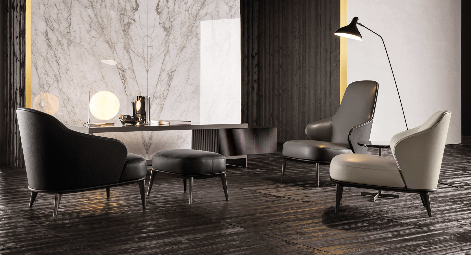 Leslie 是一系列诱人的扶手椅,提供亲密感和保护感,同时外表表达正式的优雅,这要归功于其完美的比例。内部泡沫外壳安装在完全采用皮革软垫的热模压结构聚氨酯泡沫外壳内部。