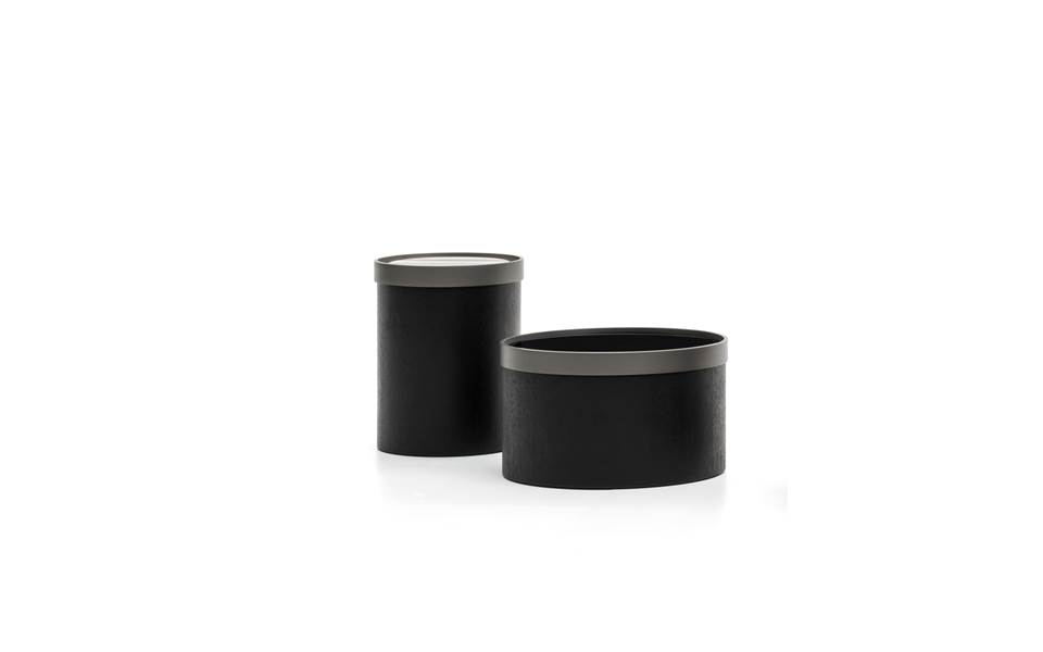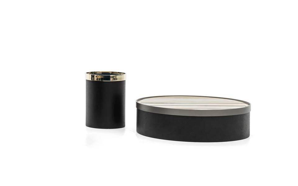 圆柱形的Bailly咖啡桌顶部有一个金属皇冠,采用抛光浅金色饰面或缎面饰面,以麦芽色上漆,让人联想到拥抱顶部的结婚戒指。
