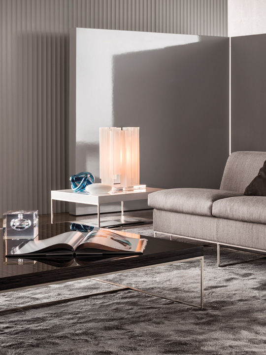 一个大家庭:一张低矮的咖啡桌和一张高的桌子,一个矩形和一个正方形;还开发了一个超大版本;一种专为灵活使用而设计的新型边桌。有几种上衣可供选择,所有上衣都具有相同的优良品质:Marquina和Afyon黑色大理石,乌木和橡木。纤薄的底座、清晰的几何形状和诗意的简约是整个系列的共同点。