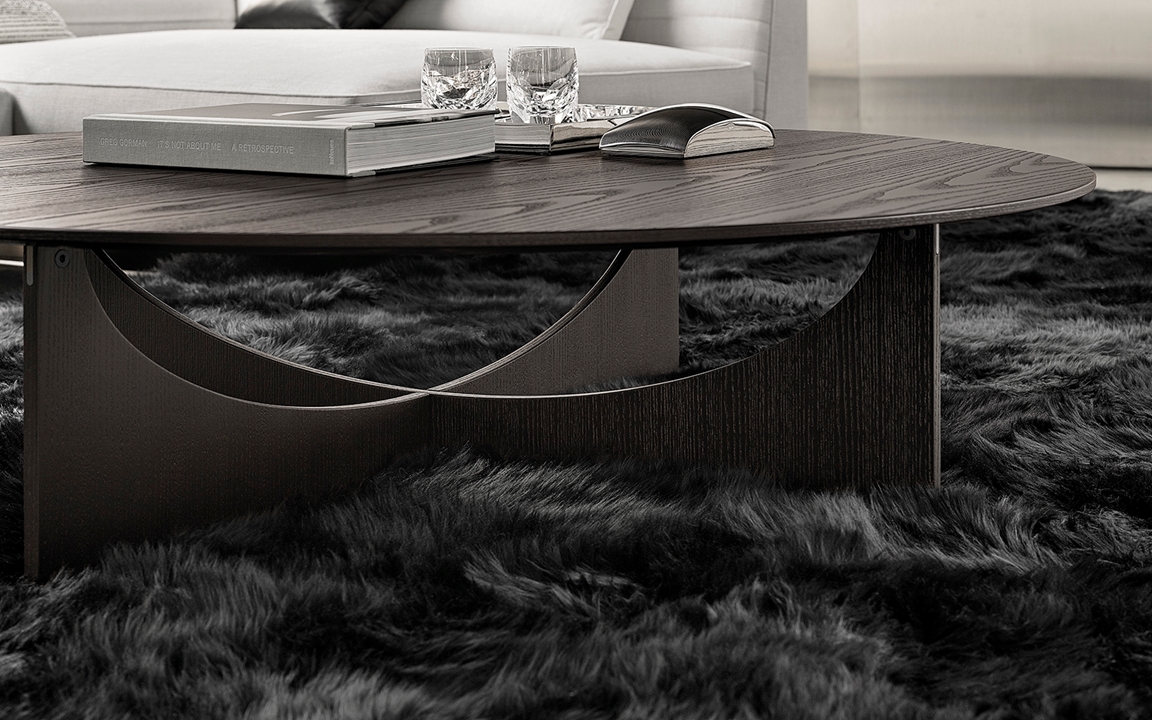 该系列还包括小型餐厅和休闲扶手椅 - 只有实木支腿 - 以及一种尺寸的咖啡桌,坐在标志性的X形铝制底座上,上面覆盖着灰烬,带有摩卡清漆饰面,圆形或方形顶部,采用Bianconero大理石或拉丝白蜡木制成,带有摩卡开孔漆面。