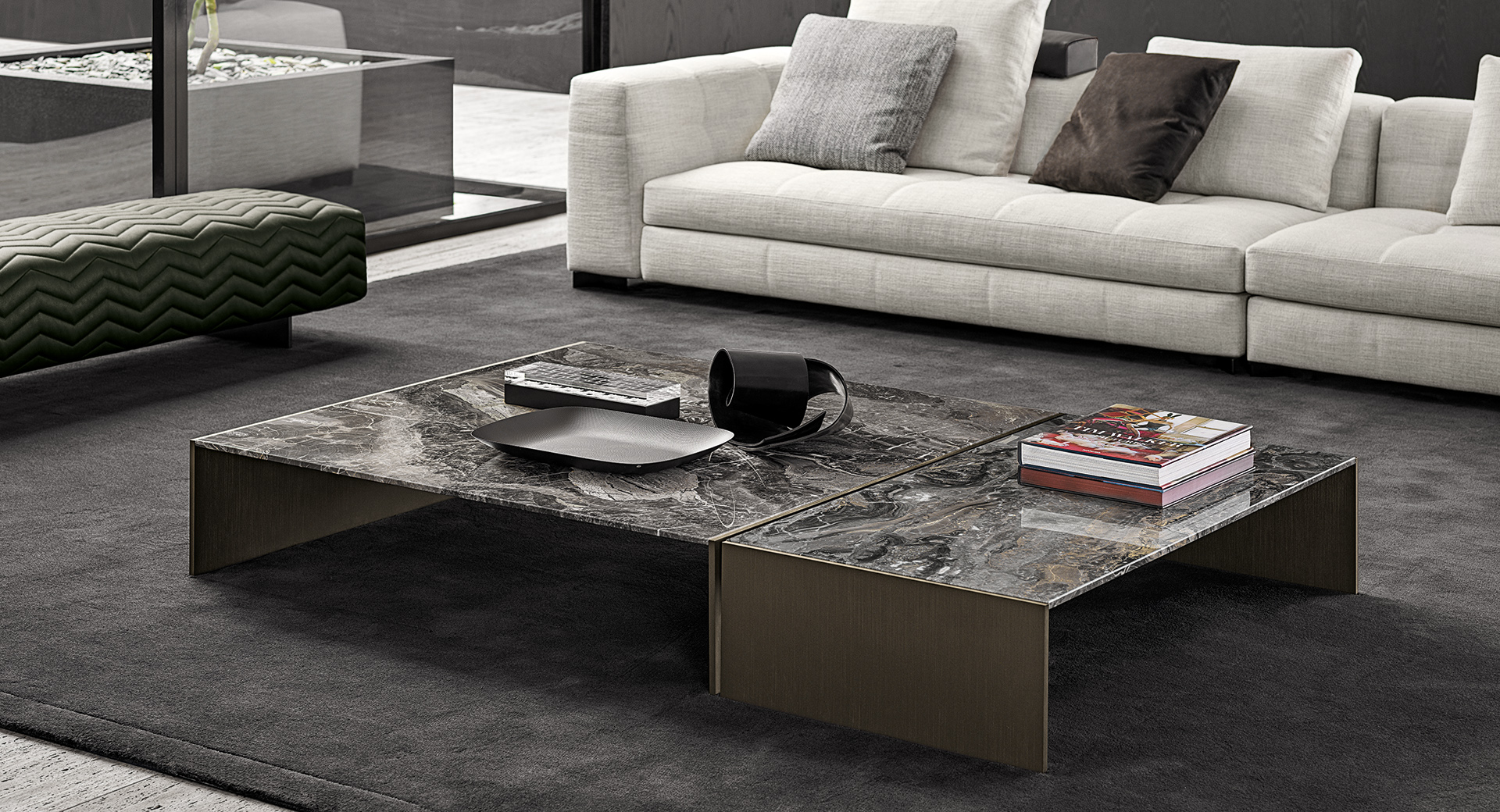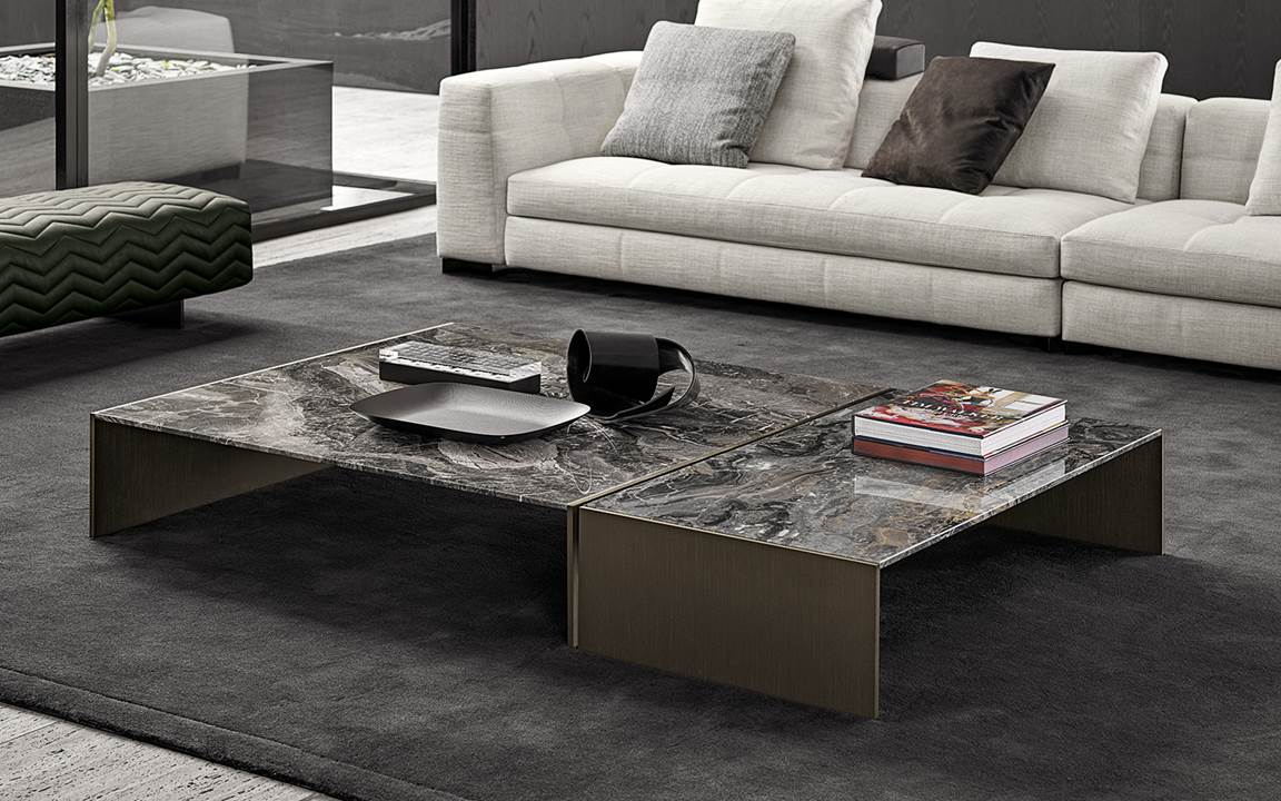 咖啡桌可以连接起来,以创建更大的表面,并设计出具有惊人冲击力的可变构图,这要归功于其桥式框架的开放和封闭体积所产生的效果。