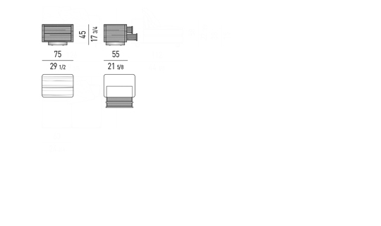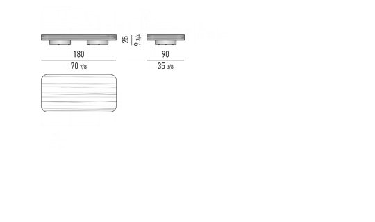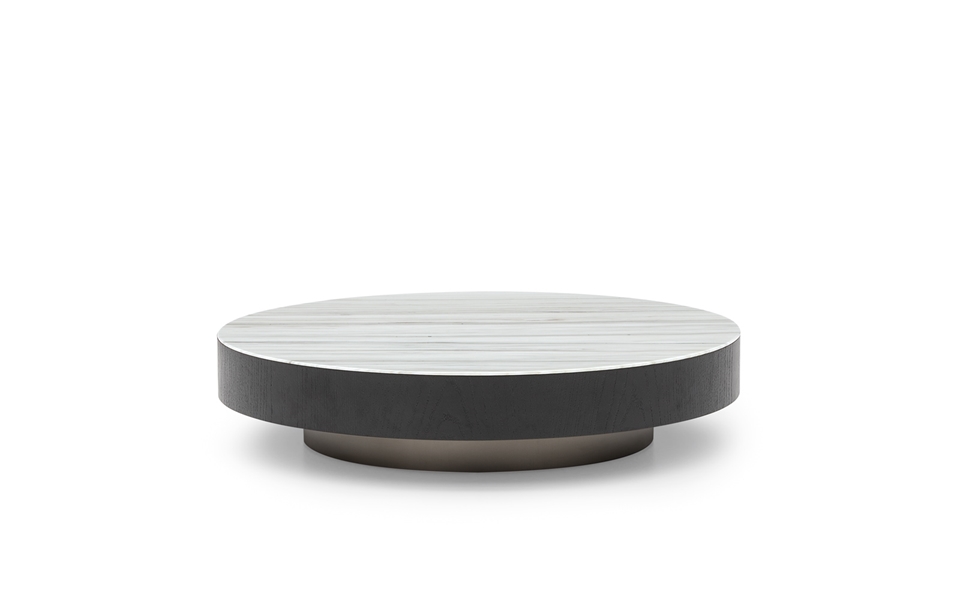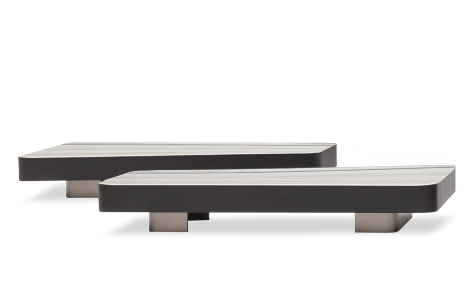 Milton 边桌由悬挂的几何体量和降低的高度并置而成,有圆形、方形、矩形和梯形版本。圆角使几何形状变得柔和,让人想起亚历山大"下降"座椅系统的蜿蜒曲线。它们的特点是对七十年代线条的更现代和装饰性的重新诠释,展示了珍贵材料和有机几何形状组合的精致游戏。