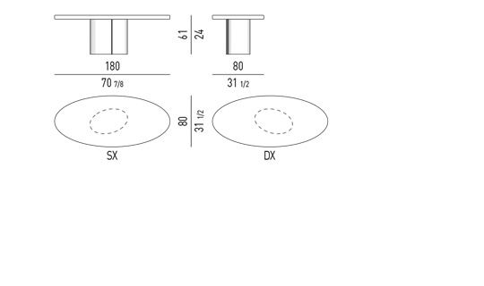 Raymond 也是一张独特的办公桌,有两种高度:61 厘米和 74 厘米。白色,沙色,花岗岩,绿色和紫色的光泽漆面椭圆形顶部可以添加到椭圆形镀铬金属底座中。