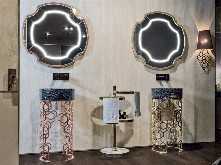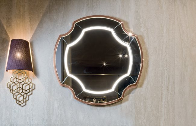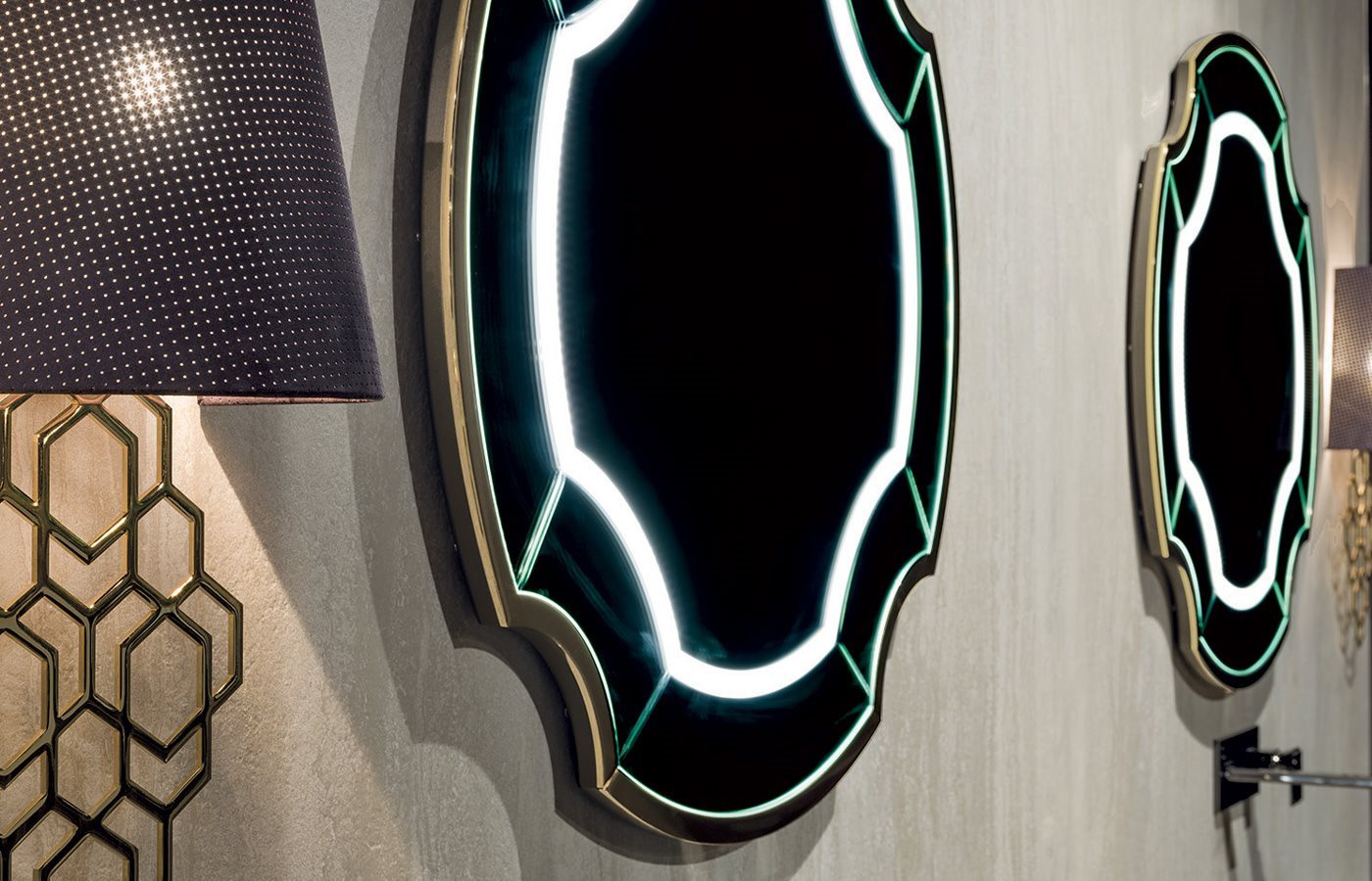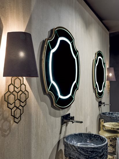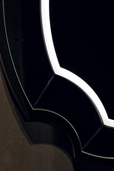 无色镜,带雕刻装饰以及led背光磨砂装饰条。 精整金属结构,面饰可选: - 亮光玫瑰金, - 哑光玫瑰金, - 亮光浅金色, - 哑光香槟金, - 亮光镀铬, - 亮光镀黑铬, - 哑光缎面青铜色。