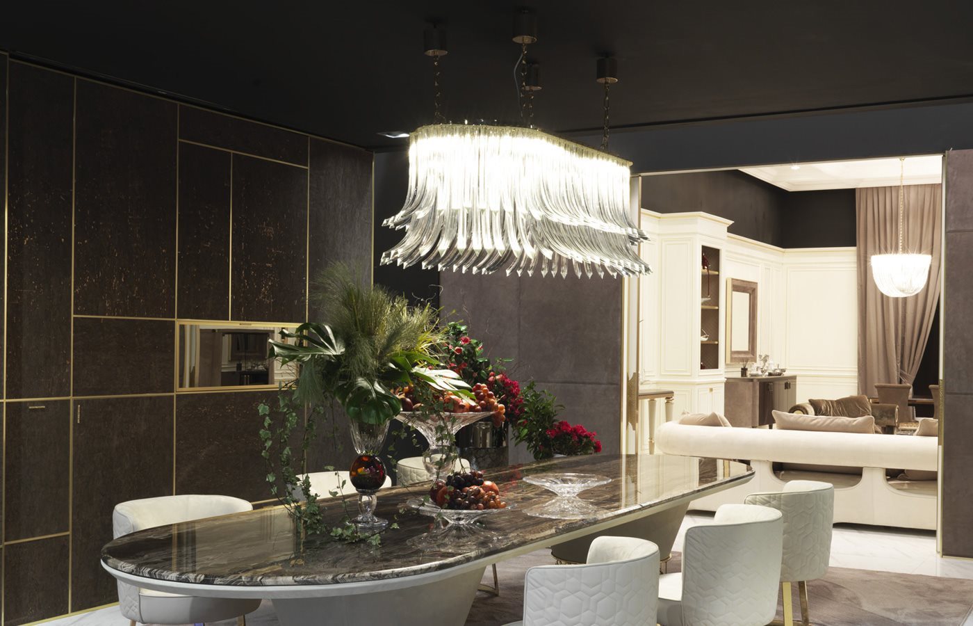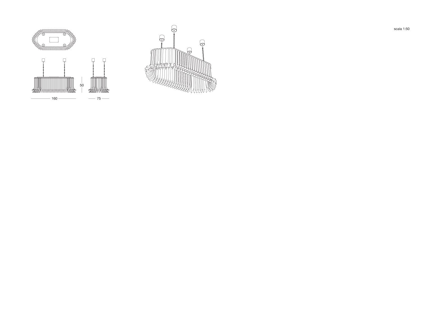 吊灯带2个4500亮度LED光板(每个3000°K),阳极氧化金属结构采用激光加工,饰面可选亮光镀铬、亮光浅金。杆状灯件为穆拉诺水晶。可调式电压110-220V。
