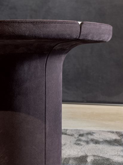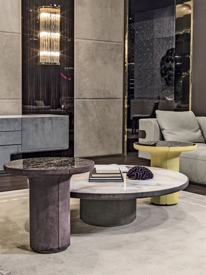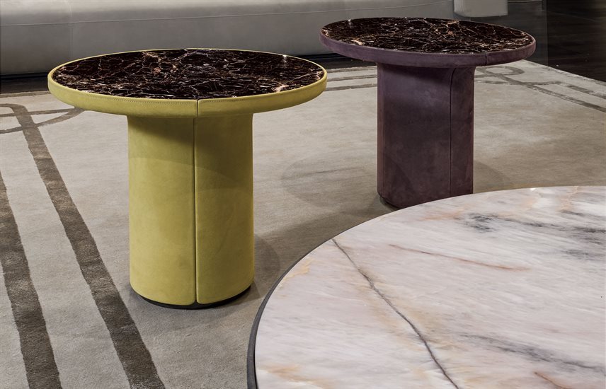 圆形茶几,内部结构采用涂漆金属制成,结构壳体则为手工模压玻璃纤维制成,覆面皮料依样本挑選。底座的金属边框采用磨削工艺制成,饰面可选:亮光浅金、亮光渐变棕、哑光香槟金、亮光镀铬、亮光镀黑铬、哑光缎面青铜、亮光玫瑰金、哑光玫瑰金、黑玫瑰金。台面可选:- 青铜色或烟熏色镜面;- 大理石:Azul Macauba、Calcite Azul、Fusion Light、Patagonia、Explosion Blu、Fusion Multicolor、Quarzo Juliet、Sahara Noir(聚酯面漆)、Dover White、Panda White、Verde Guatemala、Corteccia、Port Saint Laurent、Rosso Levanto、Bardiglio Nuvolato、Elegant Brown、Palissandro Oniciato、Emperador Dark、Silver Wave、Agatha Black、Frappuccino、Calacatta Gold;- 木材「瓣状」镶嵌加工,木质可选:西克莫槭木、亮光黑檀木、亮光卡纳莱托核桃木。