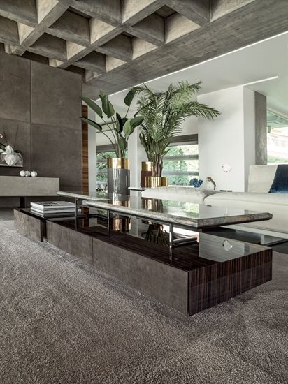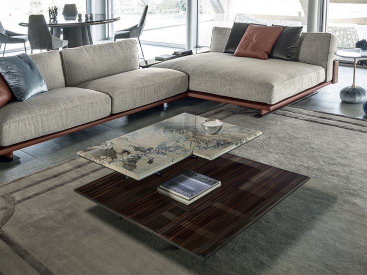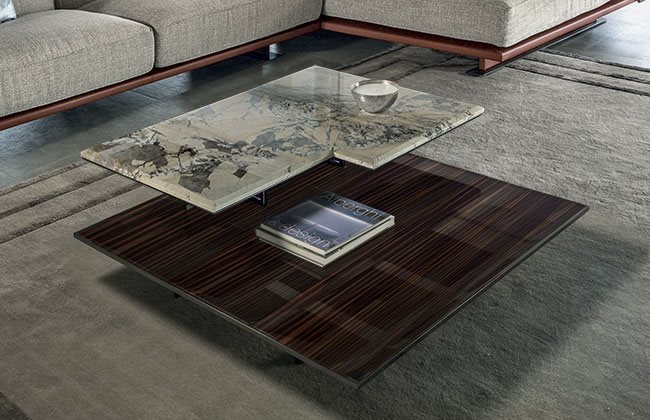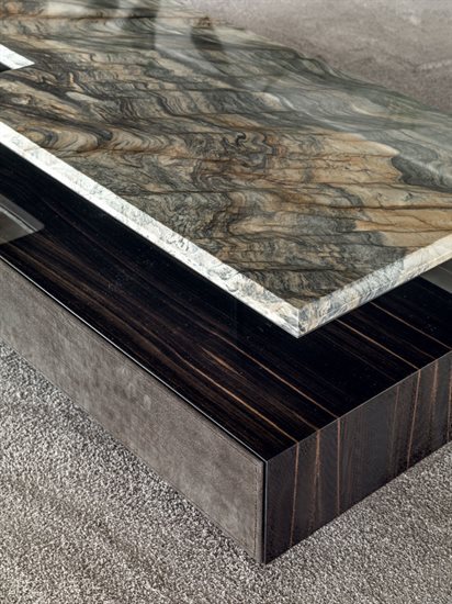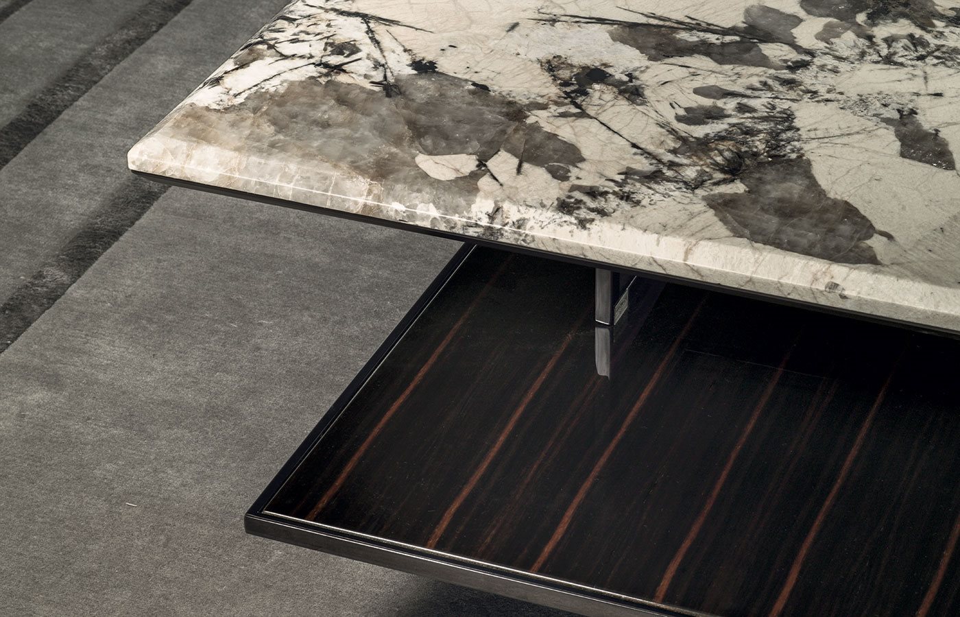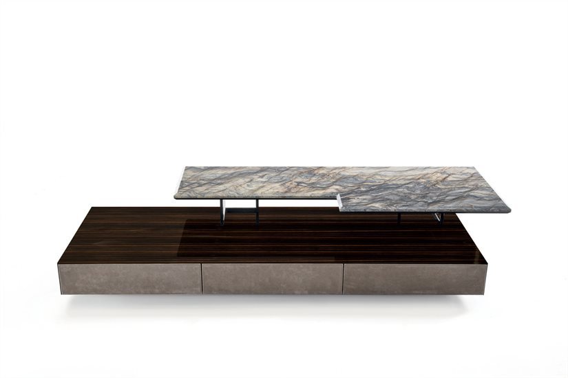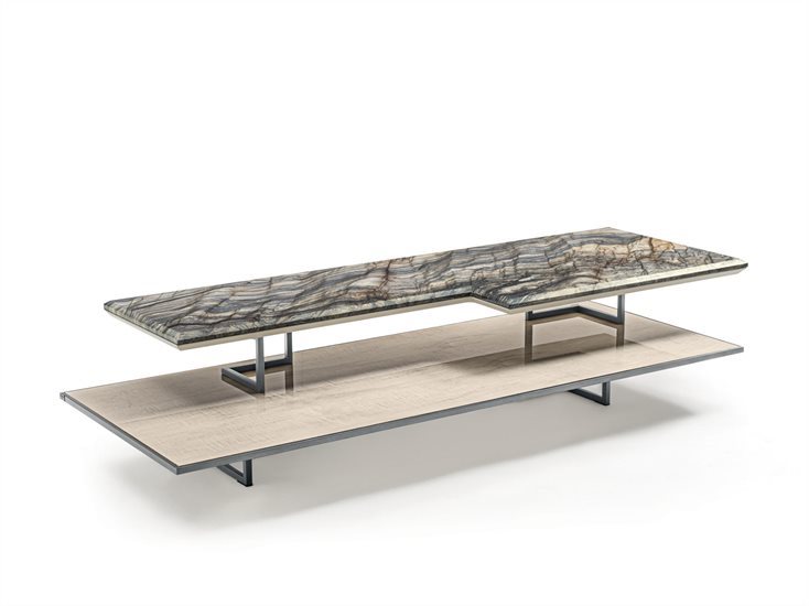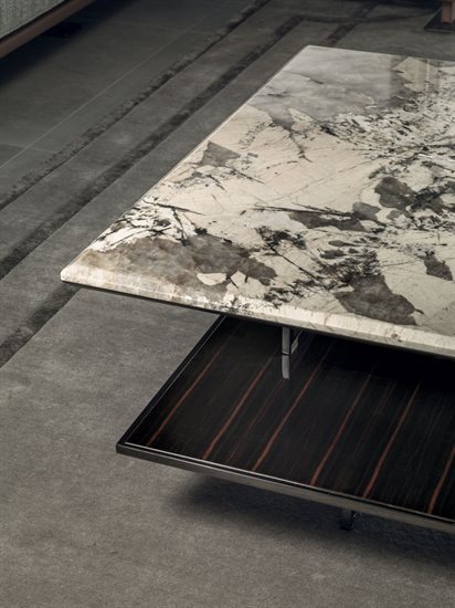 一系列不同尺寸与饰面的茶几,以重叠不同高度,几乎产生悬浮效果的平台展现特色。 下方矮茶几的部分带3格抽屉与底座,侧边与台面的木质可选:亮光烤漆(颜色依样本挑選)、亮光黑檀木、亮光卡纳莱托核桃木、亮光西克莫槭木、亮光胡桃木树榴。抽屉正面面板的覆面皮料依样本挑選。搁板可选饰面:磨斜边青铜色或烟熏色镜面;带磨斜边20mm大理石:Portoro大理石、Azul Macauba大理石、Sahara Noir大理石(聚酯面漆)、Dover White大理石、Panda White大理石、Verde Guatemala大理石、Corteccia大理石、Port Saint Laurent大理石、Rosso Levanto大理石、Bardiglio Nuvolato大理石、Elegant Brown大理石、Palissandro Oniciato大理石、Emperador Dark大理石、Silver Wave大理石、Agatha Black大理石、Frappuccino大理石、Calacatta Gold大理石、Fusion Light大理石、Patagonia大理石、Explosion Blu大理石、Fusion Multicolor大理石、Quarzo Juliet大理石、Calcite Azul大理石。