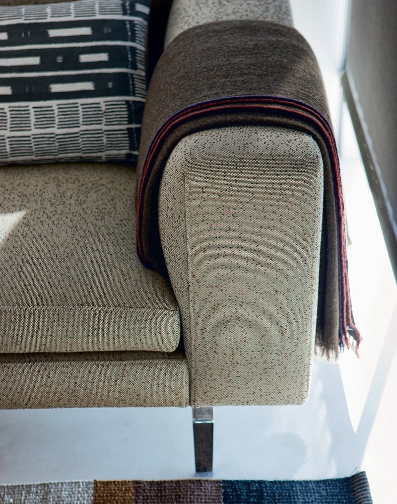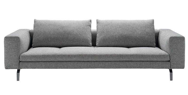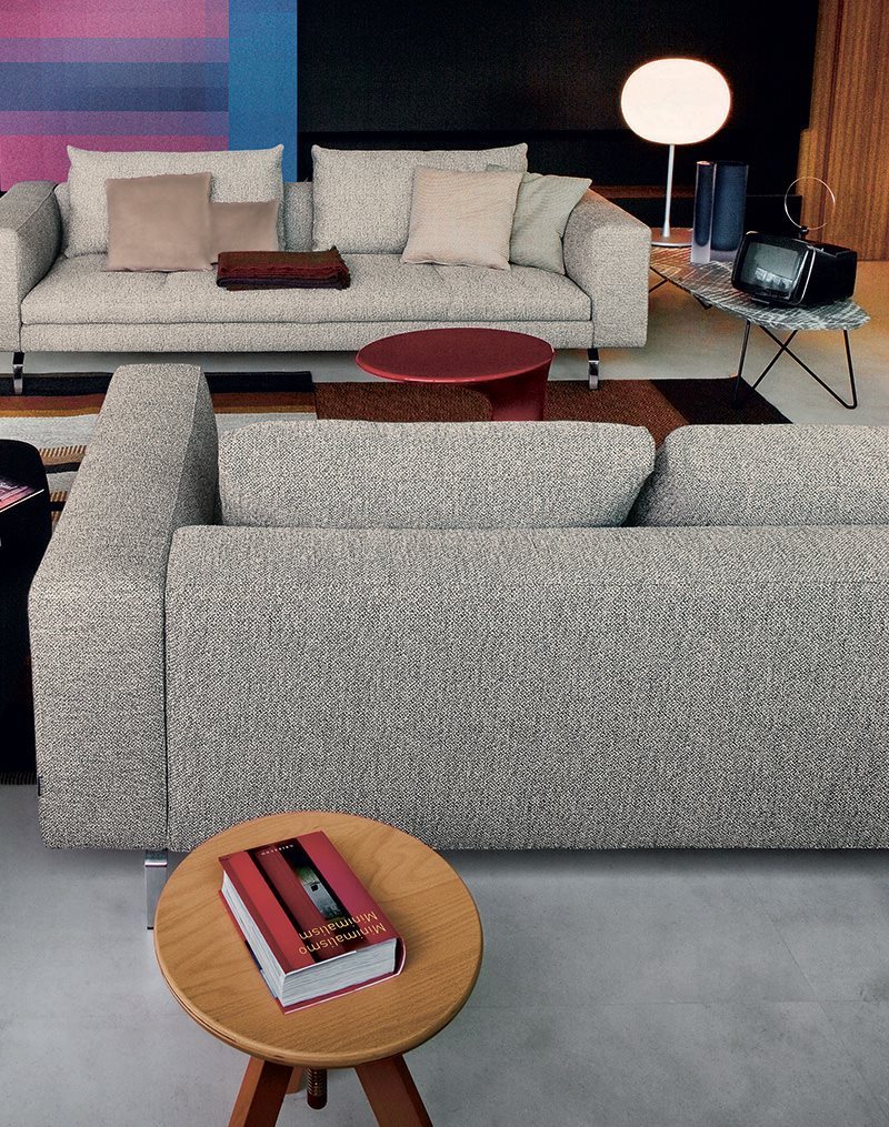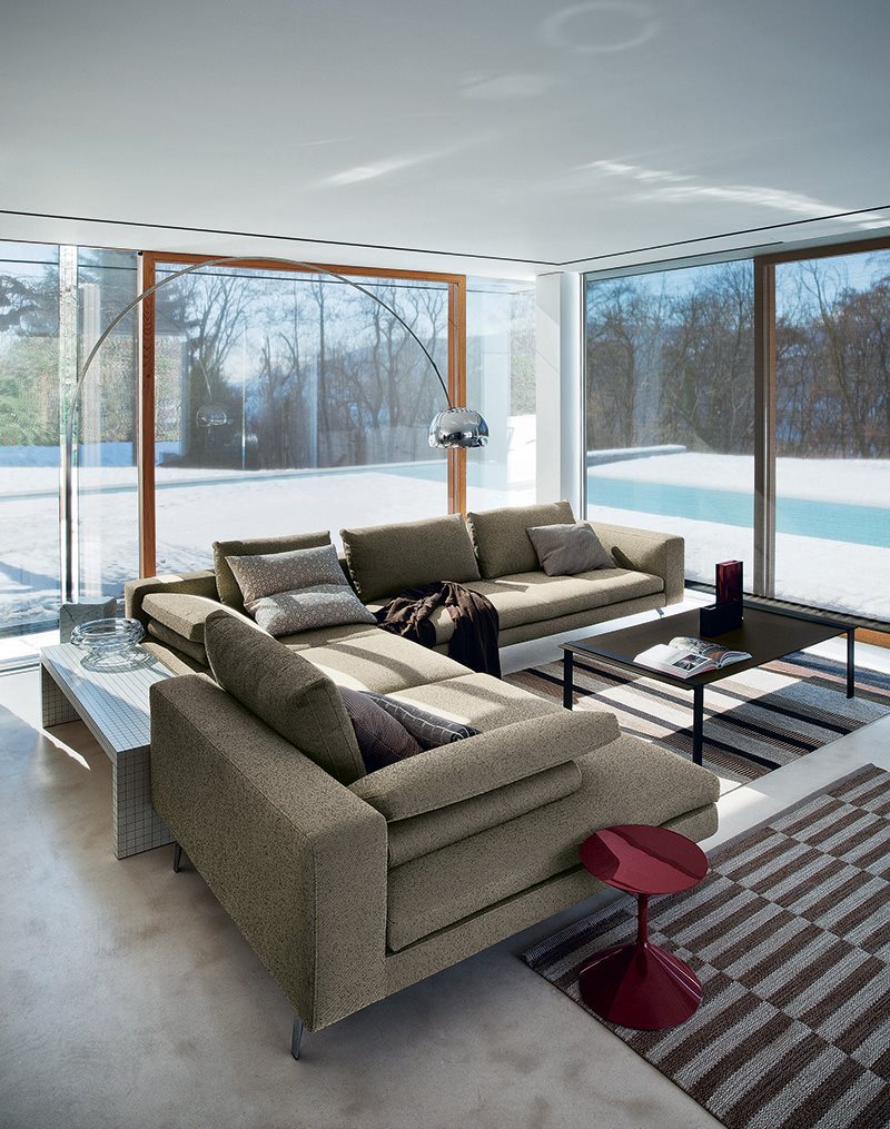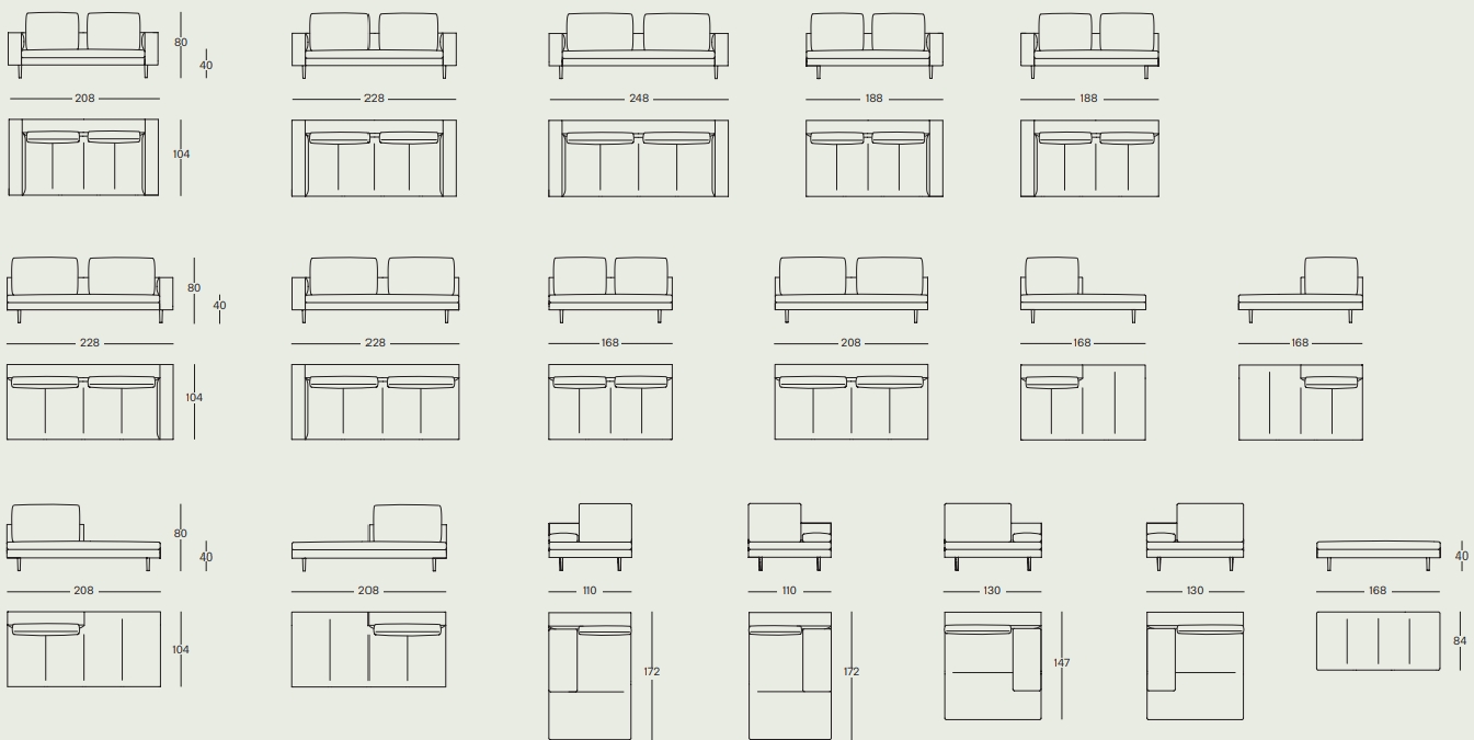 一体沙发、组合沙发、矮凳。饰以抛光铝合金、本色或黑镍缎面工艺、或黑漆。钢架结构。弹力条悬挂。渐变聚氨酯/杜邦Dacron纤维衬垫。坐垫内芯填充聚氨酯/杜邦Dacron纤维。靠垫和扶手垫内芯填充鹅毛。柱形抱枕内芯填充聚氨酯/热粘合聚酯纤维。布料或真皮护套可拆卸。