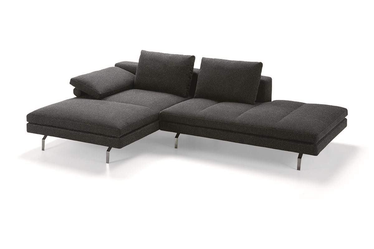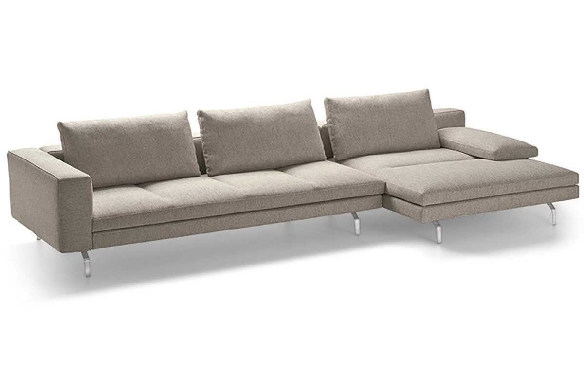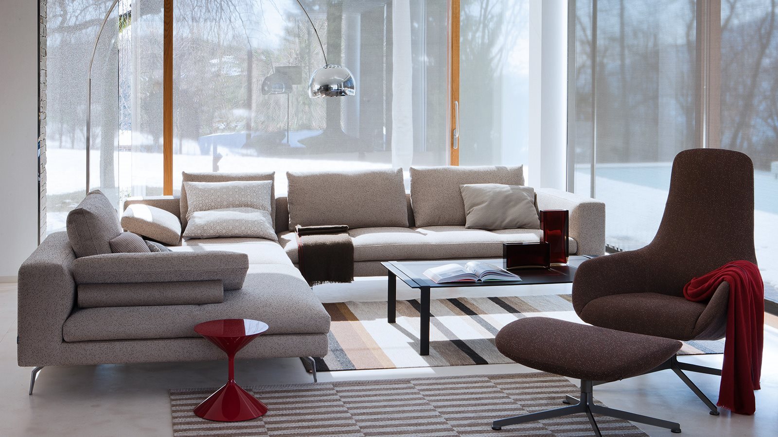 一体沙发、组合沙发、矮凳。饰以抛光铝合金、本色或黑镍缎面工艺、或黑漆。钢架结构。弹力条悬挂。渐变聚氨酯/杜邦Dacron纤维衬垫。坐垫内芯填充聚氨酯/杜邦Dacron纤维。靠垫和扶手垫内芯填充鹅毛。柱形抱枕内芯填充聚氨酯/热粘合聚酯纤维。布料或真皮护套可拆卸。