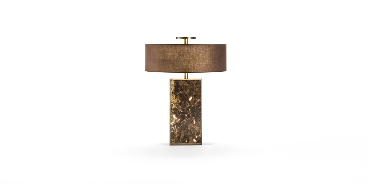 典雅、优雅、重要:Emperador 大理石的奢华,镶有一层薄薄的哑光深色青铜,由于柔和的光线将原材料与自然美景融为一体,成为风格的象征。灯罩,棕色织物,使组成更加珍贵,适合作为一个独特的家具在最多样化的背景。