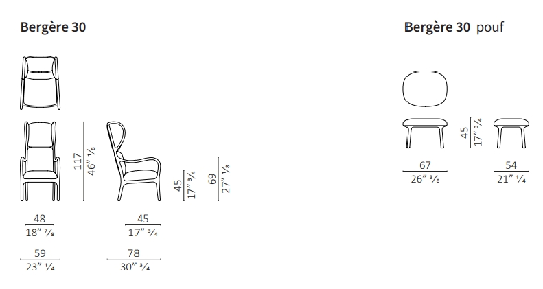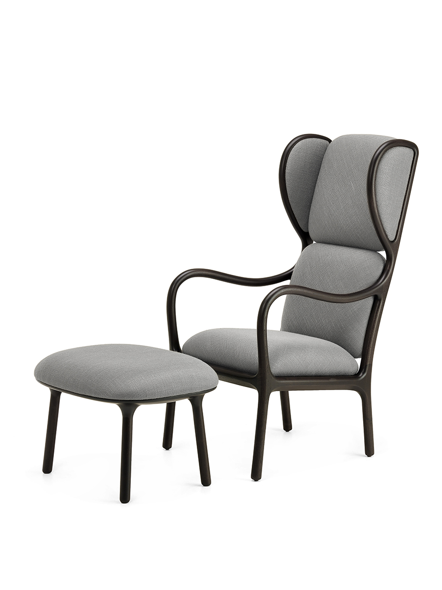 扶手椅和坐垫凳由实心美国胡桃木制成,座椅和靠背采用胶合板制成,带有软垫。