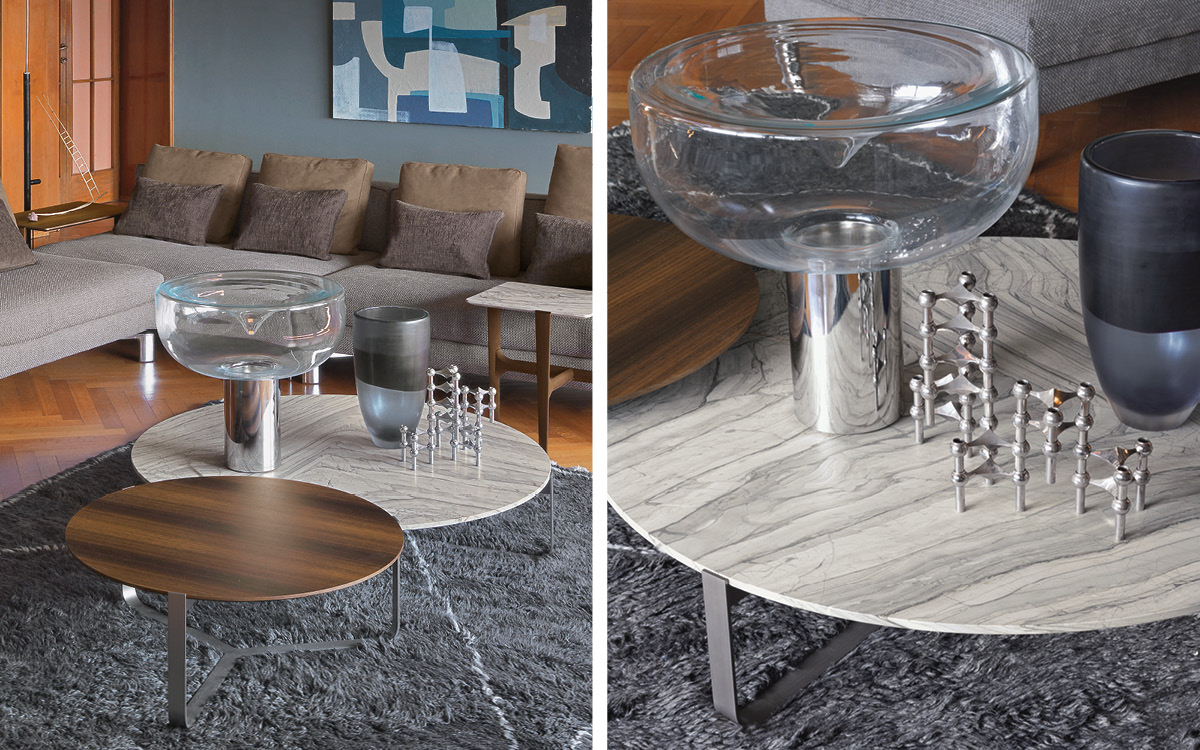 侧桌有实心钢基座,顶部直径不一,可放置在客厅中央或沙发旁边。顶部有斜边,可在以下饰面中使用:青铜玻璃 8 毫米厚,热处理哑光抛光桉树木材 20 毫米厚,或大理石 20 毫米厚。
