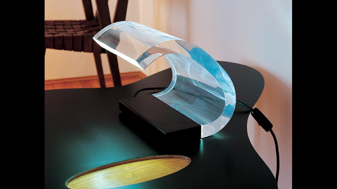 甲基丙烯酸铁在照明领域使用约十年,通常采用切割或热成形的薄片,在这里找到了一个非常特殊的用途:它的厚度和曲线意味着,由于它的传导性能,来自涂漆钢底座内的荧光灯的光线通过透明的身体移动,最终以令人难以置信的方式照亮头部。由于这种"神奇运动","281"更多的是动感艺术的作品,而不是一盏灯。