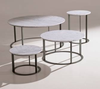 一系列具有横向特征的小桌子,让您轻松地将它们与最传统的沙发和现代沙发相结合。提供不同尺寸和高度,他们有一个大理石顶部和一个钢结构,都从各种饰面选择。