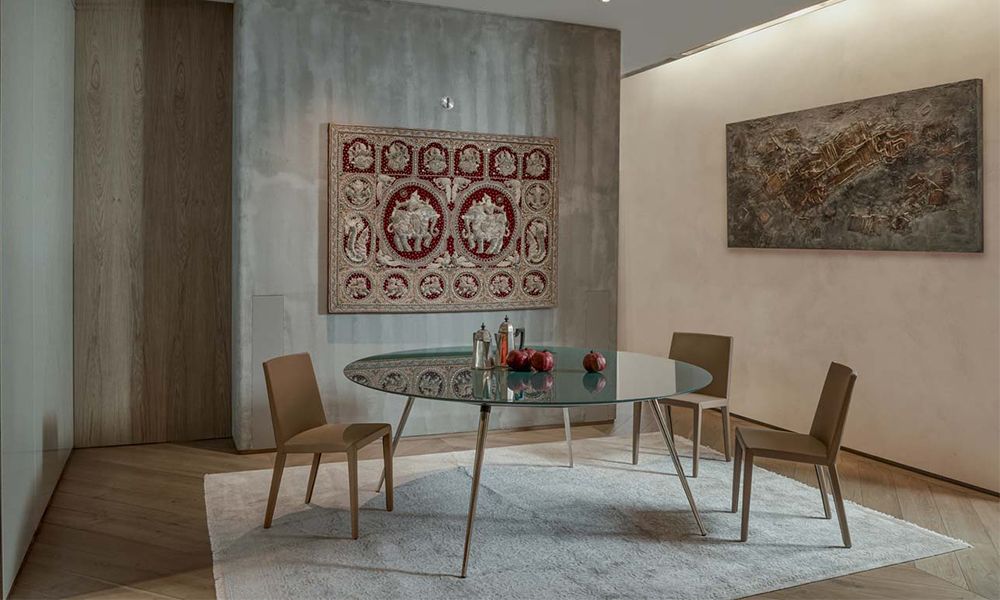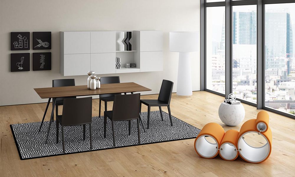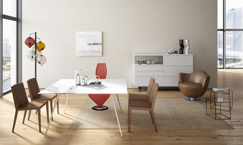 超轻到眼睛,结构坚固。由Fermé设计的"住宿桌"有细长的斜腿,支撑着各种珍贵材料的顶部:白色卡拉卡塔大理石和灰色罗马大理石;漆与哑光或光泽完成在集合的颜色;在橡木与自然,黑色或温格完成;黑色卡纳莱托