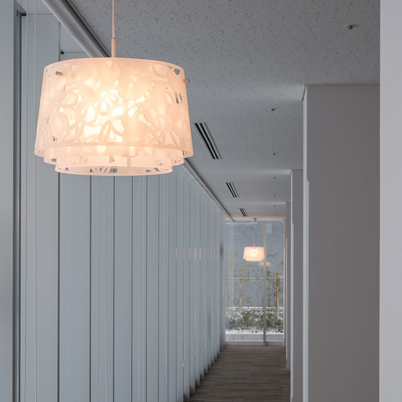 夹具主要向下发射散射光。三个激光切割丙烯酸色调上的图案经过仔细交错,目的是消除光源中令人不快的眩光。色调之间的图案不同,根据视角对光和阴影的感知不同。安装较低的抗光片阴影将获得柔软舒适的光线。