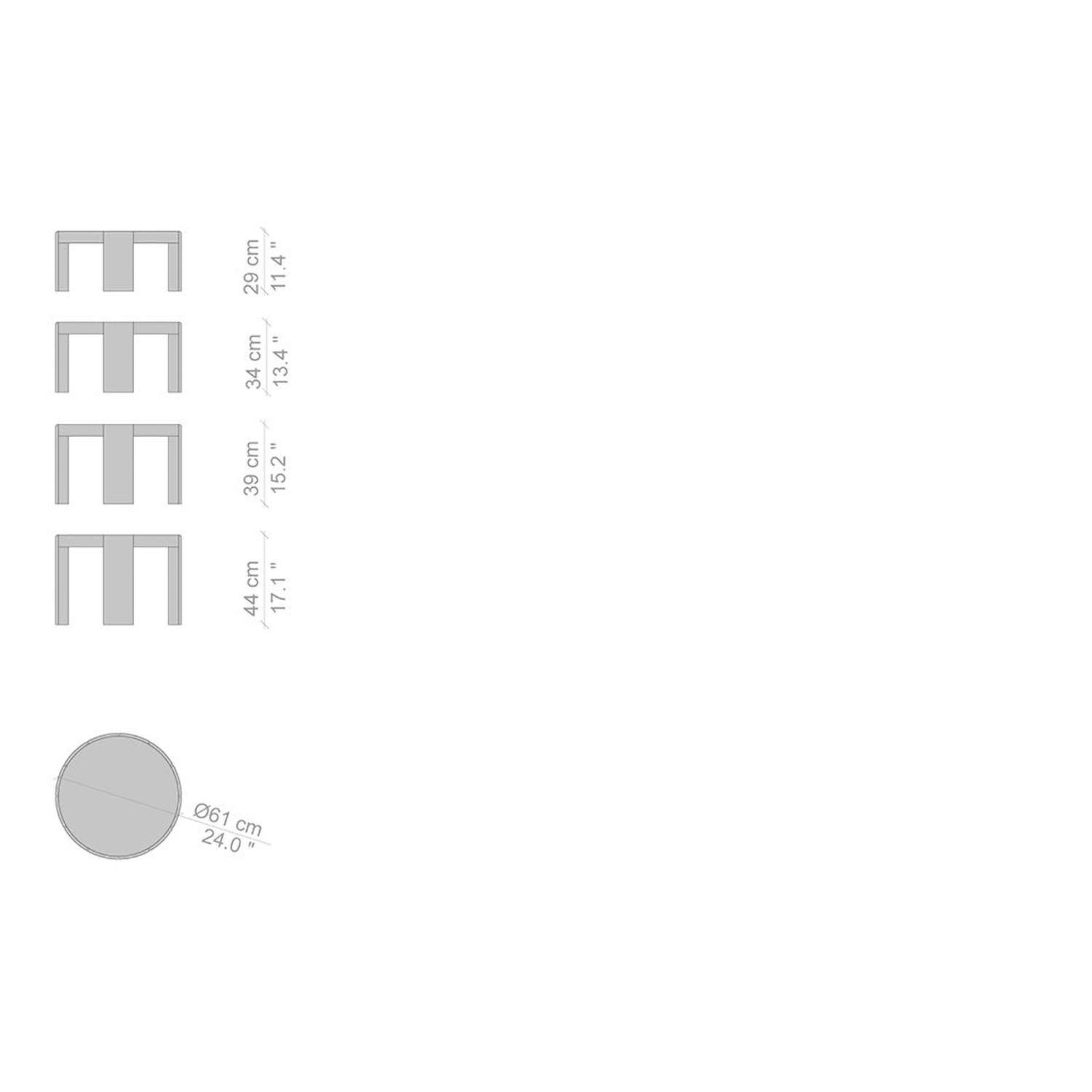 该系列成为 60 年代设计的象征,这个时代强烈倾向于乐观和实验,以寻求绝对的功能性。由 Gianfranco Frattini 构思的提案包括四张直径从 42 厘米到 61 厘米的矮桌,其特点是高度逐渐降低,可以以独特而紧凑的形状堆叠在一起,其雕塑效果让人想起鼓的形状。胡桃木染色的山毛榉木或黑漆山毛榉木结构配有天然塑料层压板架,采用单色和可逆设计。当架子被抬起时,它会露出底面的不同颜色,白漆或黑漆。今天和那时一样,该模型因其重叠所允许的巨大多功能性而受到特别赞赏。