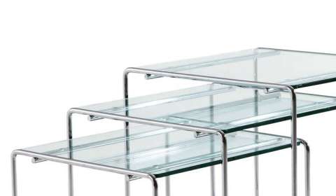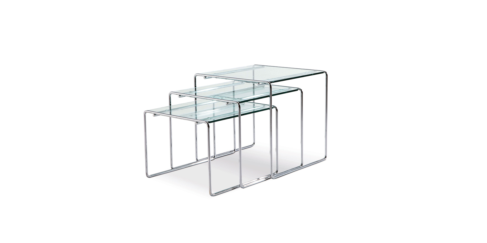 Marcel T 可堆叠设计桌通过应用镀铬钢棒形成轻巧且可堆叠的形状,这是日本大师高滨的许多项目的独特材料特征。