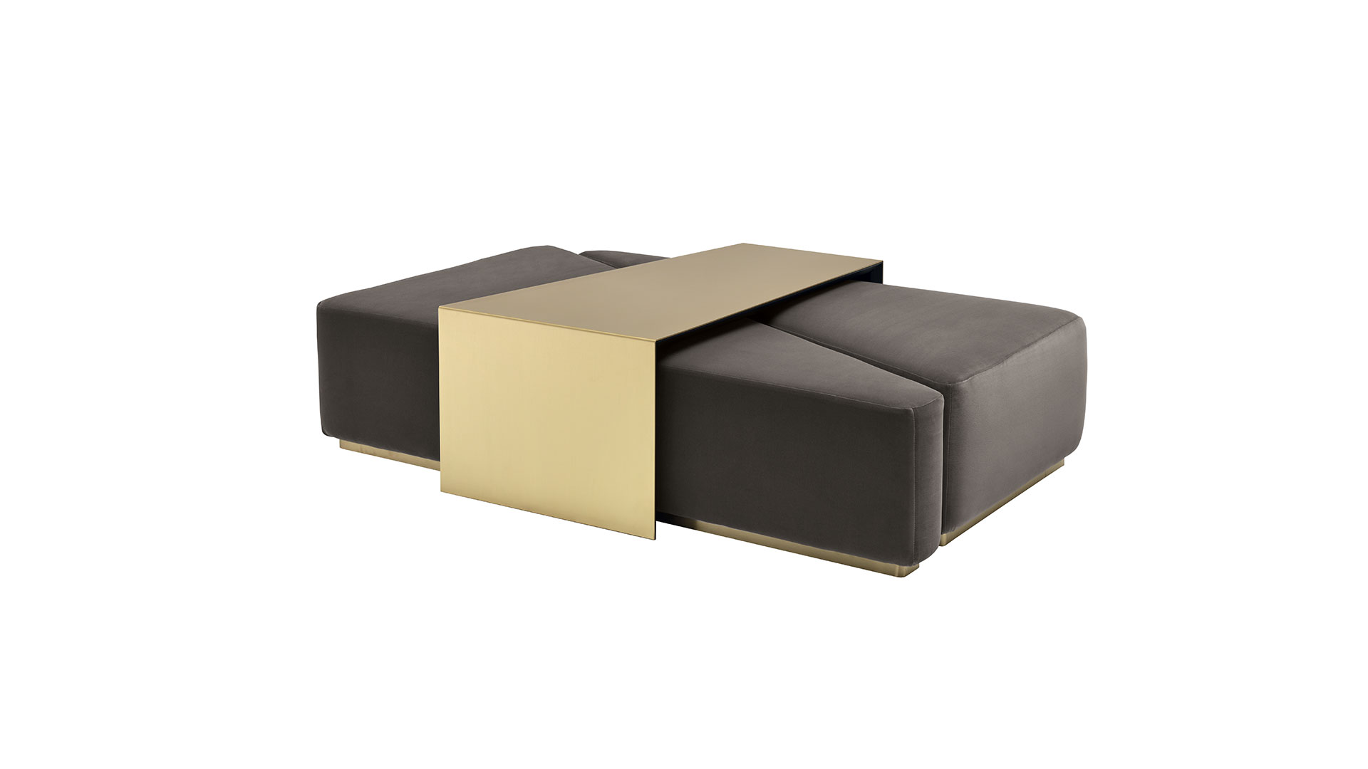 脚凳采用三角形截面织物,一个表面柔软,另一个表面刚性,用作支撑表面。底座采用缎面黄铜饰面。