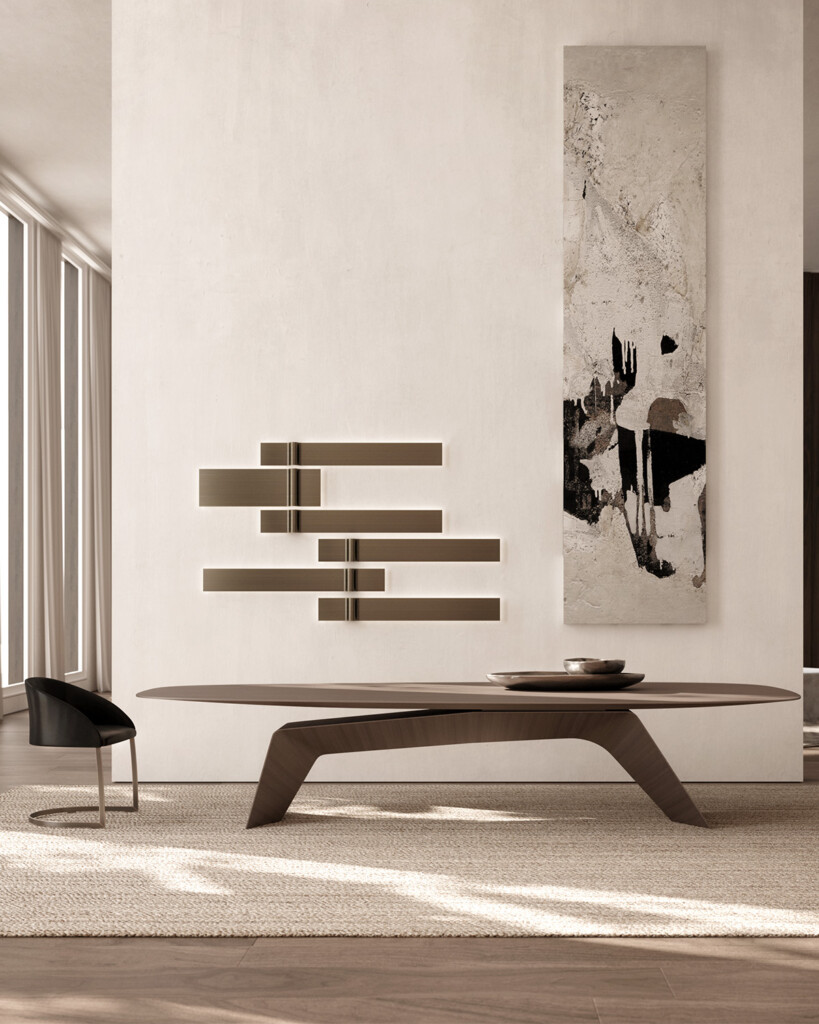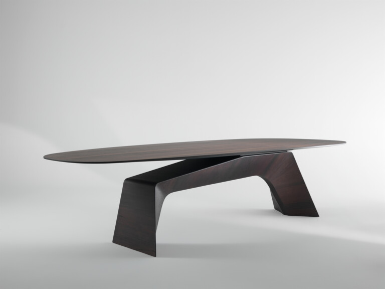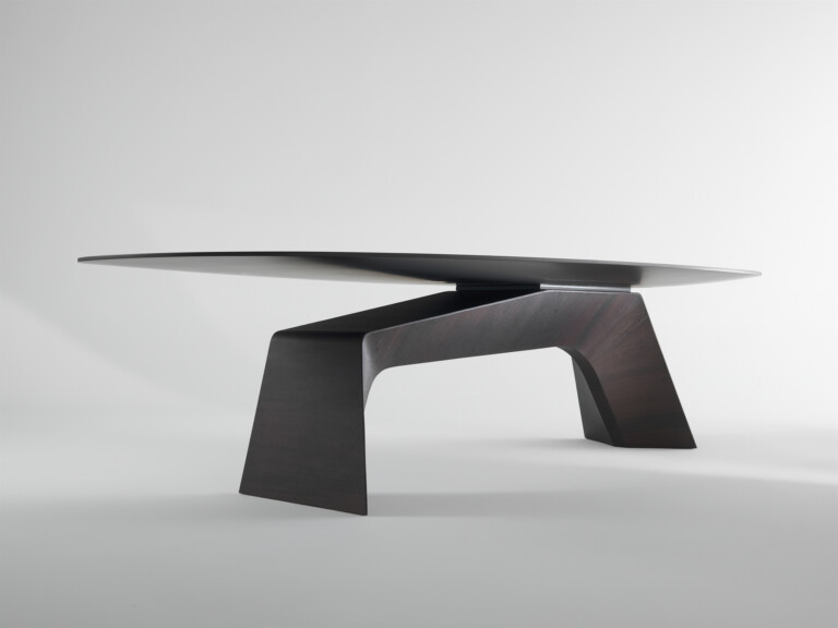 Kintai是一款具有强烈视觉冲击力的雕塑桌,其特点是构成它的元素之间的平衡游戏。一个真正的国内建筑,唤起东方世界和禅宗平衡的主题。这种平衡不仅是静态的,而且是正式的。巨大,坚固,气势磅礴的底座与薄而优雅的浮动平面形成鲜明对比。一动不动,同时动人,金台是禅宗平衡的表达。