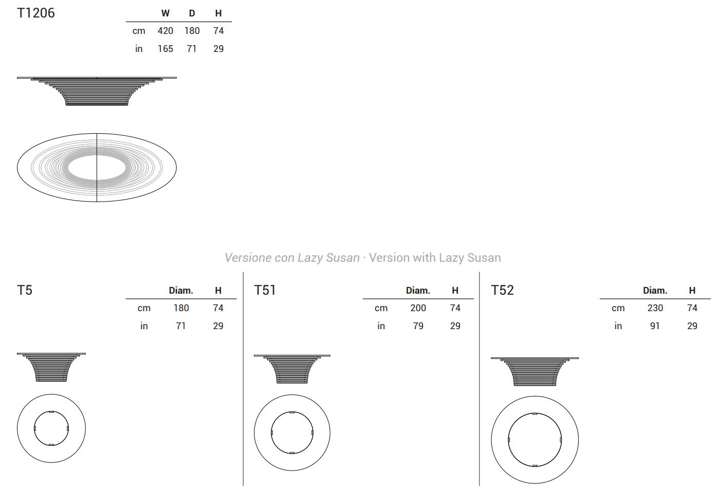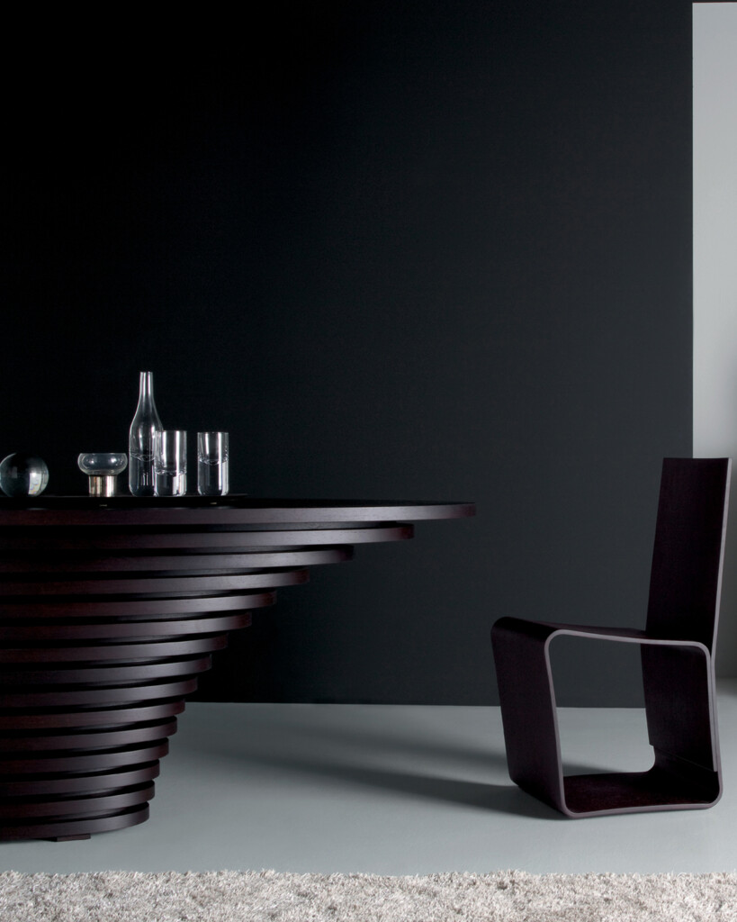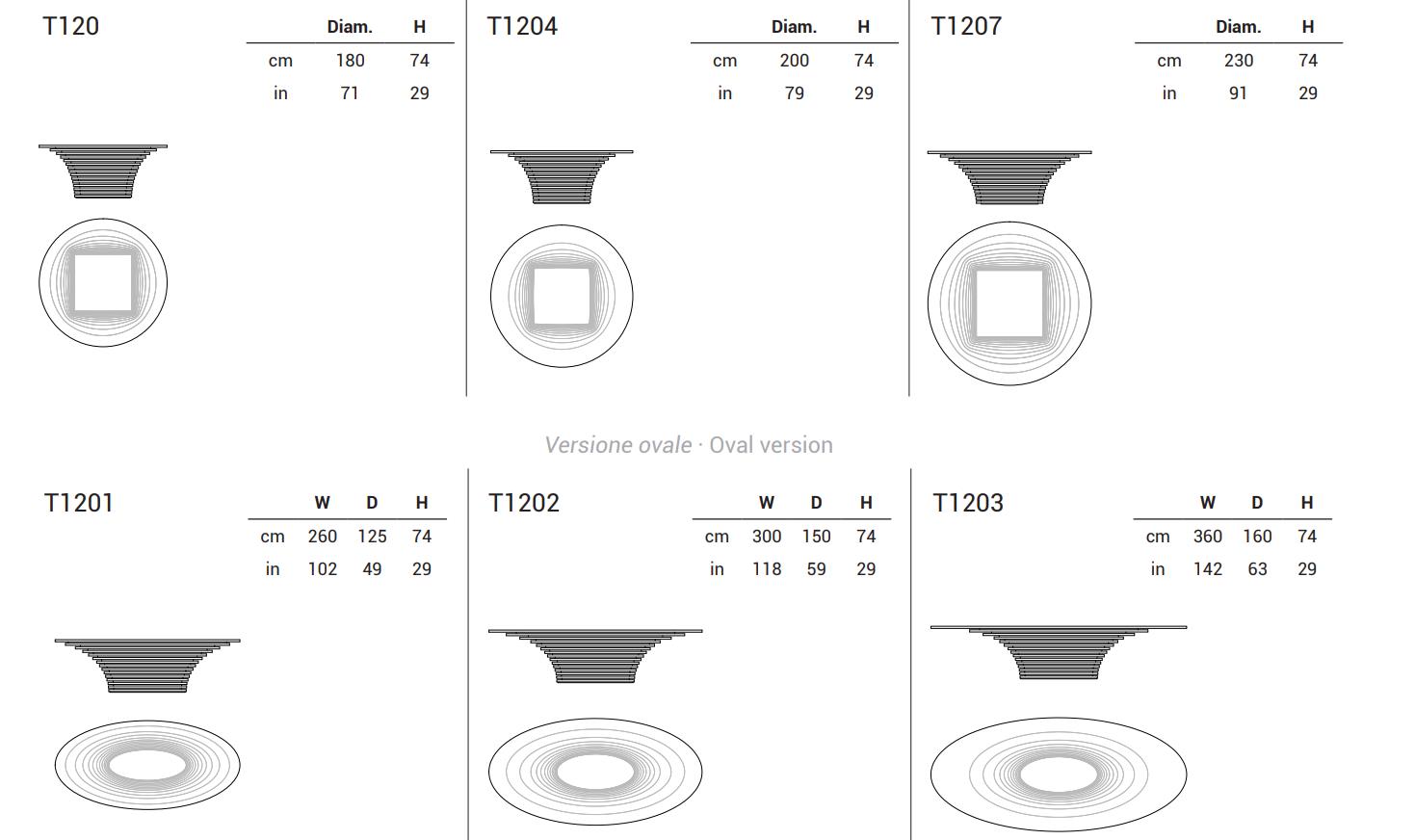 木制桌子,椭圆形或圆形,其特点是形状顶部和内部分隔元件重叠。特别是,带有圆形的版本具有正方形基部的第一个元素,并且逐渐将后续元素的形状向上转换为顶部的圆形。