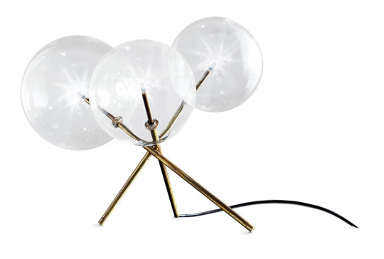 带可调光 LED 灯的台灯。透明口吹水晶球。手工抛光黄铜的金属零件。黄铜自然染色且不均匀。这种工艺赋予每件作品独特的独特性,使其独一无二。包括灯泡 (LED)。