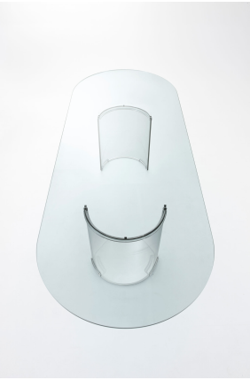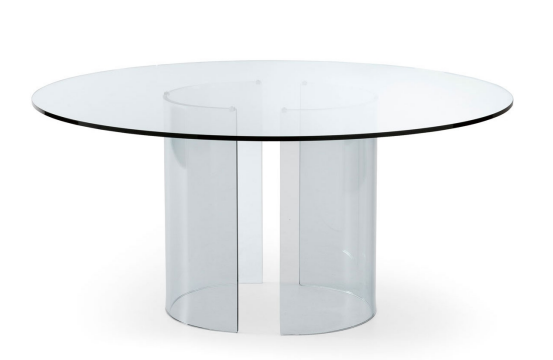 透明水晶桌。底座采用 15 毫米玻璃制成,经火和手工打磨弯曲。镀铬黄铜金属零件。也可不带金属部件(成品高度:72 厘米)。根据要求,我们可以生产特殊尺寸的台面。对于大于 260cm 的顶部,提供 4 个底座。