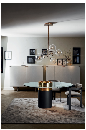 桌子采用 15 毫米透明钢化玻璃桌面。底座采用黑色开孔或锈漆木。金属零件采用抛光黄铜、手工抛光、镀铜或黑色镀铬。可移动托盘。可提供下列组合。对于大于 260 厘米的尺寸,提供 2 个底座。根据要求采用 12 毫米钢化“grigio Italia”玻璃顶部。