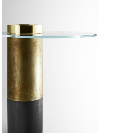 带 10 毫米超轻钢化玻璃桌面的咖啡桌。底座采用黑色开孔或锈漆木。抛光黄铜、手工抛光、铜或黑铬金属零件。