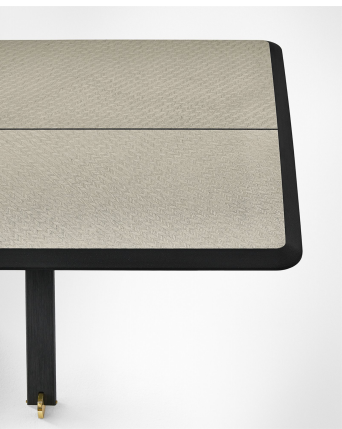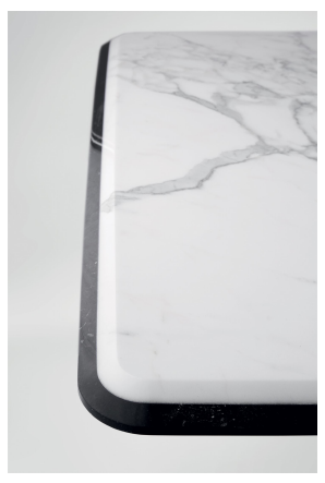 桌子采用手工拉丝和黑色阳极氧化铝结构。抛光黄铜细节。顶部采用分层斜切 Bianco Statuario 和 Nero Marquinia 大理石。还提供带有“花呢”图案的镶嵌木材。根据要求,15 毫米斜面玻璃顶部涂有亮色或缎面样品的颜色。