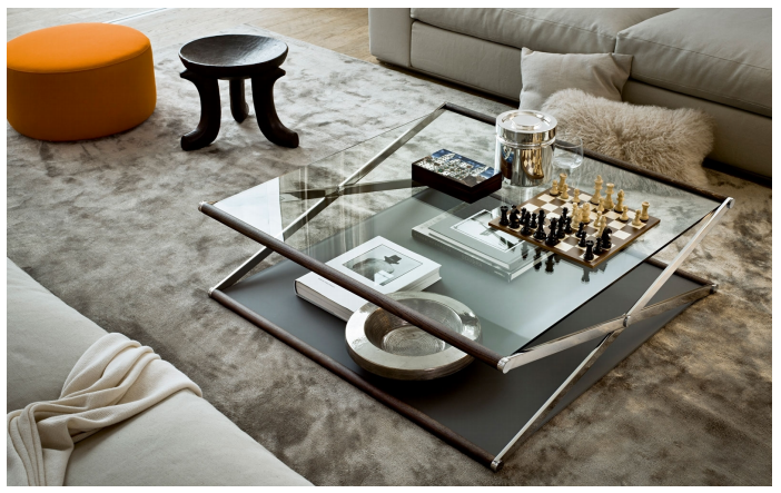 8 毫米钢化玻璃咖啡桌。透明玻璃的上部顶部。背面涂漆玻璃的下部顶部采用亮色或缎面版本样品的颜色。不锈钢或抛光金属结构,部件采用漂白橡木、鸡翅木染色或烟草染色。