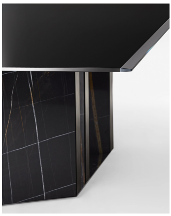 带有 15 毫米黑色背漆玻璃桌面的明亮和缎面版本的桌子。顶部两侧的重要 4 厘米斜面。木质底座覆盖 20 毫米撒哈拉黑色大理石和“超级镜面”抛光不锈钢底板。还提供 15 毫米玻璃顶部和木质底座的版本,覆盖有黑色、蓝灰色或甘草色的 6 毫米背漆玻璃,有亮色或缎面版本,或带有独特的羊绒金灰色或无烟煤饰面。